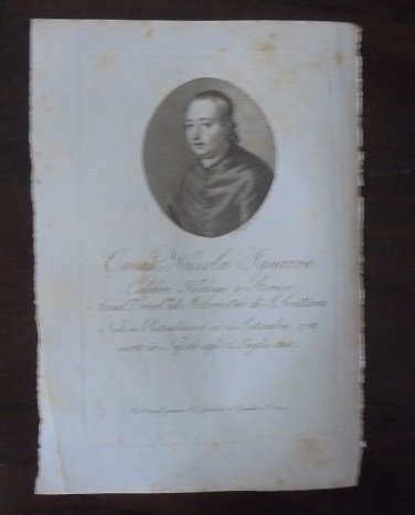 Tratta dalla Biografia degli Uomini Illustri del Regno di Napoli, di Domenico Martuscelli. Stampata a Napoli 1814/1824 da Nicola Gervasi. Ritratto in ovale di mm. 70 x 80 (=lxh) più ampi margini. Firmata in basso a destra; Morghen. Corredata da quattro pagine di biografia. Bruniture.