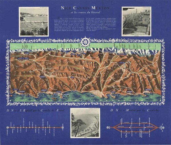 Graziosa pubblicazione pubblicitaria relativa alla Costa Azzurra ed in particolare a Nizza, Cannes e Mentone con il suggerimento di alcuni percorsi tustici che si trovano illustrati nella raffigurazione prospettica del territorio racchiuso entro decorativa cornice a motivi marittimi. Pieghe editoriali. Ottima conservazione generale