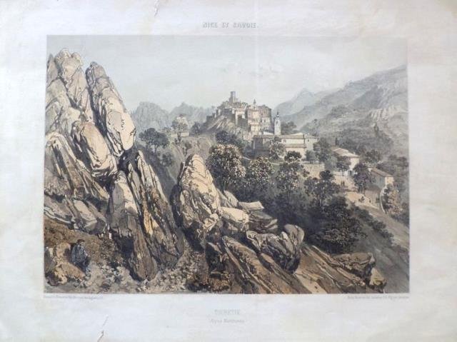 Nantes, lith. Charpentier, Edition Paris, 1850 circa. Litografia stampata in colore, cm 28 x 36 circa (il foglio). Piacevole veduta animata del paese di Tourette, nelle Alpi Marittime dell’Alta Savoia, in primo piano un dirupo roccioso con seduta una piccola figura di alpino. Tourette - du - Chateu, in italiano Torretta, ormai desueto, è oggi un comune francese situato nel dipartimento delle Alpi Marittime della regione Provenza – Alpi - Costa Azzurra; i suoi abitanti sono chiamti "les Tourrettans" in francese e "i Torrettoni" in italiano. Margini un po' rifilati e con una leggera patina di sporco, una imperfezione al margine superiore, discreto stato.