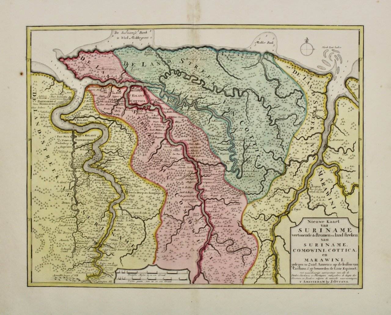Copper engraving, mm 400x520, original colour.<BR>Decorative full color example of Ottens map of Surinam. Detailed map of the northeast part of Surinam between Paramaribo and Mana. Nice wide margined example. Blank verso.