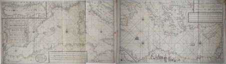 Nieuwe Paskaart van ‘t Eerste Gedeelte der Middelansche-Zee tusschen ‘t I. Cadix en ‘t I. Malta = Nouvelle Carte Marine pour la Premier Partie de la Mer-Mediterranee (.) = The New Sea Map of the First Part of the Midland-Sea (.) = Nueva Carta Maritima la Primera Parte del Mar-Mediteraneo (.) = Nuova Carta Maritima la Prima Parte del Mar- Mediteraneo & Nieuwe Paskaart van ‘t Tweede Gedeelte der Middelandsche-Zee Tusschen ‘t I. Malta en Alexandretta = The New Sea Map of the Seconde Partie of the Midland-Sea (.) = Nouvelle Carte Marine pour la Deuxiesme Partie de la Mer-Mediterranee (.) = Nuova Carta Maritima la Seconda Parte del Mar-Mediteraneo (.).Acquaforte e bulino, stampata su due fogli, rispettivamente di dimensioni 600x990 mm e 595x1000 mm. Rappresentazione nautica del Mar Mediterraneo, suddiviso nella parte occidentale ed in quella orientale.Il titolo della parte occidentale, contenuto nel grande cartiglio decorativo a sinistra, è ripetuto in ben 5 lingue: olandese, francese, inglese, spagnolo e italiano. In basso al centro è riportato l’imprint editoriale: t’ Amsterdam by Ioannes van Keulen Boek Zeeekard Verkooper en Graad boog maker aan de Oost Zyde Vande Nieuwe Brug inde Gekroonde Lootsman met privilegie Nieuwelycks op Gestel door G: v: Keulen. Il titolo della parte orientale, nel grande cartiglio in alto a destra è riportato in 4 lingue ma non in spagnolo. In basso al centro si legge: t’ Amsterdam by Ioannes van Keulen Boek-Zeeekard Verkooper en Graad boog maker aande Oost Zyde van de Nieuwe brug inde Gekroonde Lootsman Opgestelt door G: v: Keulen. met Privilegie.Si tratta di una variante della carta precedente della tipografia Van Keulen - firmata da Johannes I Van Keulen e dal figlio Gerard e databile al 1709 - che vede le lastre emendate e leggermente ridotte (di circa 10 mm): vengono aggiunti degli elementi decorativi nel foglio di destra, dove è disegnato un gruppo di figure in abiti orientali che circonda il cartiglio; nel mare compaiono due navi collocate a largo di Malta e Cipro. Secondo Nils Persson (cfr. Loose printed Sea Charts published by Van Keulen, p. 177) le carte non sono parte di nessuna raccolta nautica, ma venivano vendute singolarmente.Nell’angolo superiore sinistro della tavola occidentale troviamo, fuori scala in un cartiglio, la rappresentazione del Mar Adriatico; nel foglio orientale, in basso a destra, troviamo il particolare della costa libica: Barbaria van I. Zerby tot Tripoli. La prima versione della carta appartiene al terzo volume dello Zee-Fakkel, del quale è una delle tavole aggiunte nel 1709 da Gerard van Keulen. Firmata da Johannes Van Keulen (1654 - 1715), la carta è completata e stampata dal figlio Gerard (1678 - 1726), il cui nome è riportato in entrambi i cartigli. Sebbene, secondo Koeman, la carta sarebbe stampata solo nel 1734 (cfr. AN, IV, p. 341, Keu 95 e V, p. 203), Irene Jacobs conferma che la carta appartiene all’aggiornamento dello Zee-Fakkel del 1709 (cfr. Charts in Zee-Fakkel and Zee-Atlas, p. 204). Il primo atlante Van Keulen nel quale abbiamo riscontrato la presenza della carta è il terzo volume dello Zee-Fakkel, edizione francese del 1723: Le Nouveau & Grand Illuminant Flambeau de la Mer (…) par Nicolas Jansz Vooght, & Gerard van Keulen, Geomêtre, & Maistre en Mathematiques. Imprime a Amsterdam: par Jean Van Ceulen, Marchand Libraire de Cartes Marines. A° 1723. Conservato alla Biblioteca Nacional di Madrid, il volume è citato ma non descritto da Koeman (cfr. AN, IV, p. 345, Keu 103 D). Le raccolte nautiche di Johannes van Keulen non erano composte da carte progettate intenzionalmente per questo tipo di opere: una quarantina di carte furono pubblicate per la prima volta nel 1680, ma il numero delle tavole aumentò sin da subito; nel 1683 - quando furono pubblicate le parti I, II, III, e IV - il numero aumentò a 116 mappe. L’atlante più voluminoso, apparso nel 1695, comprende 160 mappe di Johannes v. Neuwe Paskaart van ‘t Eerste Gedeelte der Middelansche-Zee tusschen ‘t I. Cadix en ‘t I. Malta = Nouvelle Carte Marine pour la Premier Partie de la Mer-Mediterranee (.) = The New Sea Map of the First Part of the Midland-Sea (.) = Nueva Carta Maritima la Primera Parte del Mar-Mediteraneo (.) = Nuova Carta Maritima la Prima Parte del Mar- Mediteraneo & Nieuwe Paskaart van ‘t Tweede Gedeelte der Middelandsche-Zee Tusschen ‘t I. Malta en Alexandretta = The New Sea Map of the Seconde Partie of the Midland-Sea (.) = Nouvelle Carte Marine pour la Deuxiesme Partie de la Mer-Mediterranee (.) = Nuova Carta Maritima la Seconda Parte del Mar-Mediteraneo (.).Etching and engraving, printed on two sheets, respectively 600x900 and 595x1000Nautical representation of the Mediterranean Sea, divided into the western and eastern parts.The title of the western part, contained in the large decorative cartouche on the left, is repeated in 5 languages: Dutch, French, English, Spanish and Italian. At the bottom of the page is the editorial imprint: t 'Amsterdam by Ioannes van Keulen Boek Zeeekard Verkooper en Graad boog maker aan de Oost Zyde Vande Nieuwe Brug inde. The title of the eastern part, in the large cartouche at the top right, is shown in 4 languages but not in Spanish. At the bottom center reads: t 'Amsterdam by Ioannes van Keulen Boek-Zeeekard Verkooper en Graad boog maker aande Oost Zyde van de Nieuwe brug inde Gekroonde Lootsman Opgestelt door G: v: Keulen. met Privileges.It is a variant of the previous map of the Van Keulen's - signed by Johannes I Van Keulen and by his son Gerard and datable to 1709 - which sees the changes and slightly reduced plates (of about 10 mm): decorative elements are added to the sheet on the right, where a group of figures in oriental clothes is drawn surrounding the cartouche; in the sea two ships appear off the coast of Malta and Cyprus. According to Nils Persson (see Loose printed Sea Charts published by Van Keulen, p. 177) the maps are not part of any nautical collec