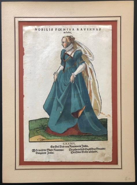Hans Weigel, Norimberga, 1577 circa. Xilografia (incisione su legno), vecchia coloritura, cm 19,5 x 30 (il foglio). Bella figura di donna in costume dell’incisore svizzero Jost Amman (Zurigo, 1539 – Norimberga, 1591), attivo a Basilea e poi a Norimberga dal 1561. Di lui ci restano disegni e incisioni di qualità e una pregevole illustrazione della Bibbia del 1584 circa. Questo foglio è tratto dalla prima edizione dell’ opera "Habitus praecipuorum populorum, tam virorum quam foeminarum singulari arte describei. Trachtenbuch darin fast allerley und der furnembsten Nationen die heutigs tags bekandt sein", pubblicata da H. Weigel a Norimberga verso il 1577. Buon esemplare in vecchia e bella coloritura. .