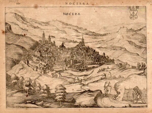 NOCERA UMBRA -“ Bella veduta dall'alto della città e dintorni, animata da alcuni popolani; titolo e stemma in alto