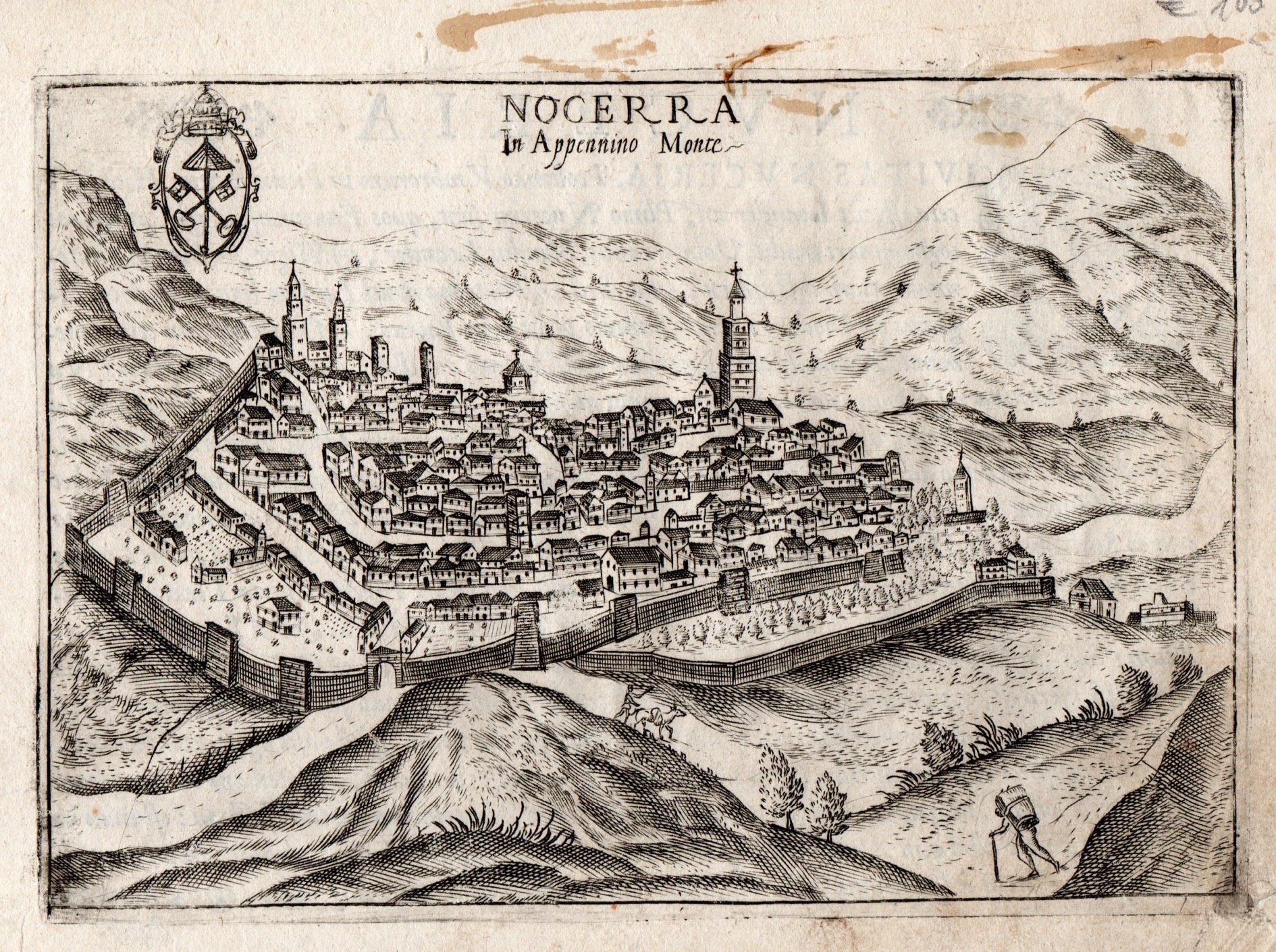 Incisione in rame, dipinta a mano, mm 130x187. Tratta da "Theatrum urbium Italicarum" prima edizione di questa raccolta di piante e vedute di città (senza dubbio da preferire per freschezza di stampa delle lastre alla successiva), ristampata successivamente a Vicenza nel 1616 da Domenico Amadio con l'aggiunta di alcune tavole (67 tavole invece delle 59 originali). Testo latino al verso, di autore ignoto, anche se alcuni studiosi ipotizzano sia dello stesso Bertelli. Aloni in alto e difetti rinforzati al margine dell'angolo destro inferiore.