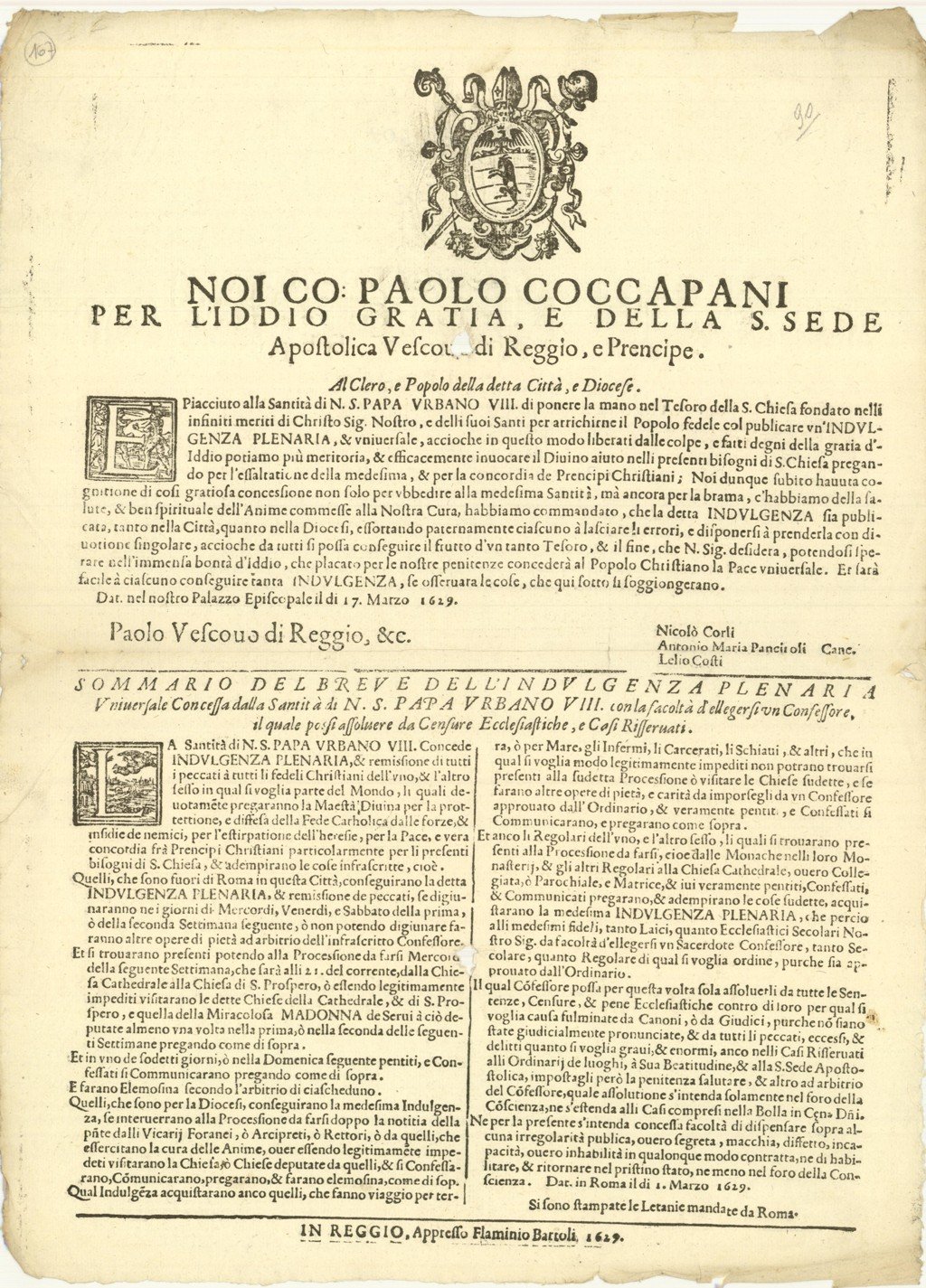 Noi co: Paolo Coccapani per l’iddio gratia, e della S. sede Apostolica Vescovo di Reggio, e Prencipe