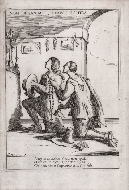 Proverbio illustrato che sconsiglia di fidarsi troppo; in una chiesa si vedono due uomini che pregano accanto all'altare, uno dei quali, inginocchiato dietro, si vede borseggiare l'altro mentre tiene in mano un rosario; si vedono ex-voto e dipinti appesi al muro della cappella. Acquaforte, 1678, firmata in lastra in basso ' 'GM. Mitelli I. e F'. ' Iscrizione in versi in basso. L’opera appartiene alla serie dei ' Proverbi figurati. Giuseppe Maria Mitelli fu un prolifico artista, con oltre seicento le incisioni nel suo catalogo. Realizza opere di riproduzione e numerosi soggetti che commentano in chiave popolaresca fatti storici, temi morali e situazioni sociali, fra questi ultimi la serie più nota ' Le Arti per via, basata su un gruppo di disegni di Annibale Carracci e le 48 tavole per la serie ' Proverbi figurati consecrati al Serenissimo Principe Francesco Maria di Toscana, ' che mostrano l’umanità dell’artista e la sua attenzione per i particolari e i personaggi. ' A lui si debbono anche illustrazioni per romanzi cavallereschi e serie di carte da gioco. Bellissima prova, su carta vergata coeva, con margini, in ottimo stato di conservazione. Bibliografia L. Marinese, ' Proverbi figurati di Giuseppe Maria Mitelli, ' 1967; Bertarelli 1940; ' Le Incisioni di Giuseppe Maria Mitelli, catalogo critico, ' n. 465; Bartsch, ' Le Peintre graveur ' (XIX.294.110). Illustrated proverb advising against trusting too much; in a church, two men seen praying by the altar, one of them, kneeling behind, seen pickpocketting the other one while holding a rosary; ex-votos and paintings seen hanging on the wall of the chapel. Etching, 1678, numbered and lettered with proverb; signed ' 'GM. Mitelli I. e F'; lettered below image with an Italian poem. The work belongs to the ' Proverbi figurati ' series. Giuseppe Maria Mitelli was a prolific author of more than six hundred engravings, he produced reproductions and numerous subjects commenting on historical facts, moral themes, and social situations in a popular vein, including the best-known series ' Le Arti per via, based on a group of drawings by Annibale Carracci, and the 48 plates for the series ' Proverbi figurati consecrati al Serenissimo Principe Francesco Maria di Toscana, which show the artist's humanity and his attention to detail and characters. He is also credited with illustrations for novels of chivalry and series of playing cards. Beautiful proof, on contemporary laid paper, with margins, in very good condition. Bibliografia L. Marinese, ' Proverbi figurati di Giuseppe Maria Mitelli, ' 1967; Bertarelli 1940; ' Le Incisioni di Giuseppe Maria Mitelli, catalogo critico, ' n. 465; Bartsch, ' Le Peintre graveur ' (XIX.294.110). Cfr.
