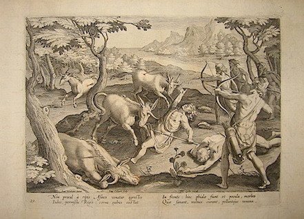 Incisione originale su rame (cm. 26x19,3 più ampi margini) da un disegno di Jan Van Der Straet (Giovanni Stradano) tratta dall’opera ‘Venationes Ferarum, Avium, Piscium.’. Carta filigranata. Ottimo esemplare. Cfr. Baroni Vannucci, p. 371.