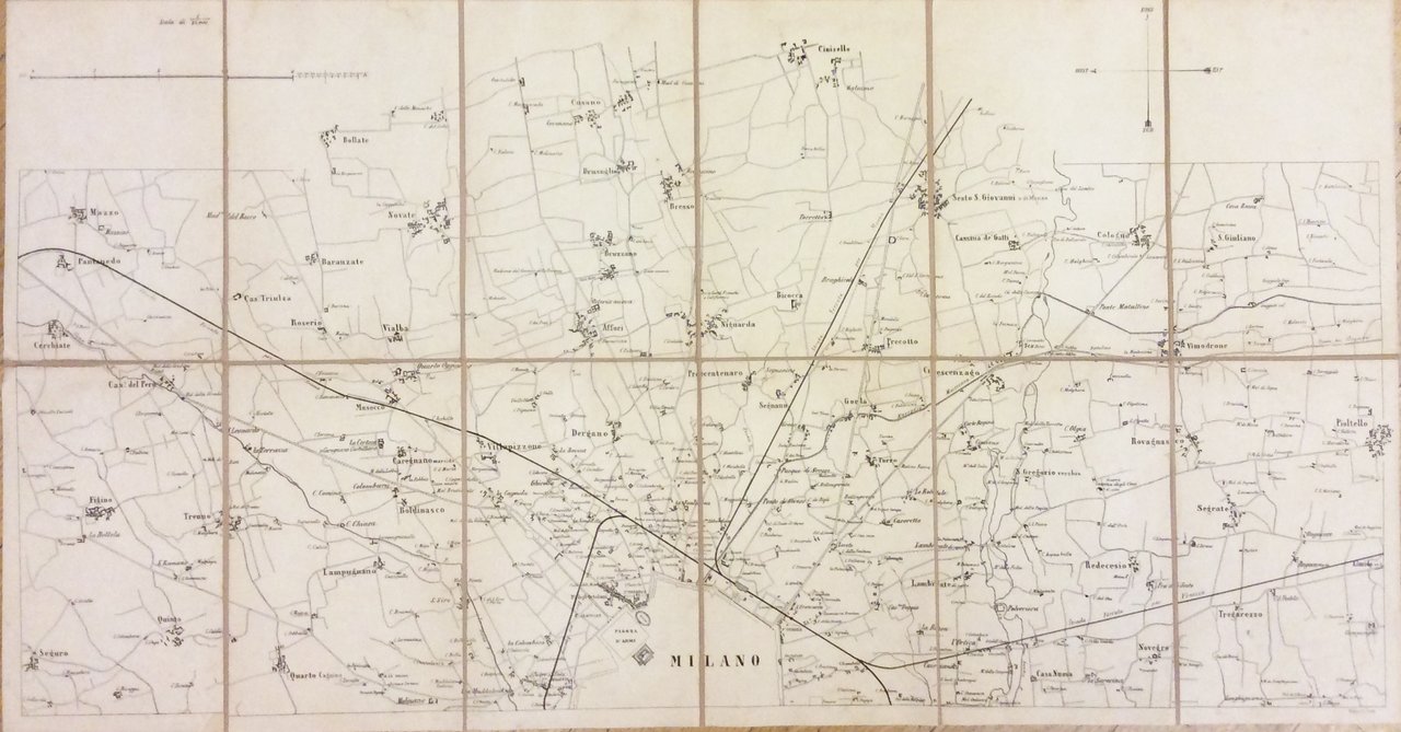 Carta topografica in litografia della zona Nord di Milano, di cm. 45 x 86, montata su tela e suddivisa in 12 riquadri. Ripiegata, in un astuccio in cartonato moderno (cm. 23x15,2), è ben conservata.