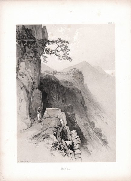 Veduta della città tratta da ' Illustrated Excursion in Italy, ' pubblicato a Londra da Thomas M'Lean nel 1843-46. Lear fu infaticabile e coraggioso viaggiatore, eseguì schizzi prima in Europa nel Mediterraneo poi in Egitto e nel Medio Oriente. Egli voleva, come si espresse, “topographise all the journeyngs of my life”. Per citare sommariamente, pubblicò ' Views of Rome and its Environs ' nel 1841, due serie di ' Illustrated Excursions in Italy, Journal of a Landscape Painter in Southern Calabria, Views in seven Ionian Islands ' e ' Journal of Landscape Painter ' in Corsica ' nel 1870. ' Litografia tinta, in ottimo stato di conservazione. View of the city, taken from ' Illustrated Excursion in Italy, published to London by Thomas M’Lean between 1843 and 1846. Lear was an indefatigable and courageous traveller and sketched first in Europe in the Mediterranean and then in Egypt and the Middle East. He wanted to, as he put it, “topographise all the journeyngs of my life”. To mention only a few, he published ' Views of Rome and its Environs ' in 1841, two series of ' Illustrated Excursions in Italy, Journal of a Landscape Painter in Southern Calabria, ' Views in seven Ionian Islands ' and finally ' Journal of Landscape Painter in Corsica ' in 1870. ' Lithograph, very good condition. Cfr.