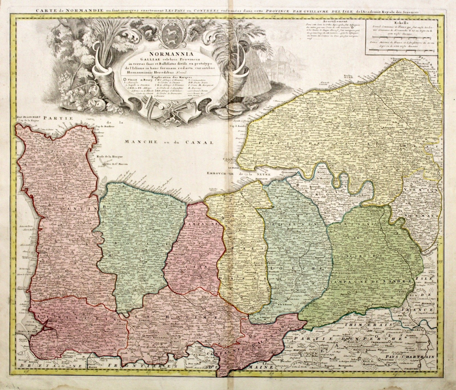 Incisione in rame su disegno di Rizzi Zannoni, mm 490x580, dipinta d'epoca. Interessante carta geografica con bel cartiglio figurato. La dicitura "Eredi Homann" distingue l'attività tipografica intrapresa dai figli e generi di J.B. Homann, nato a Norimberga nel 1663. Questi, dopo l'apprendistato presso D. Funk e G. Sandrart, nel 1702 iniziò una propria produzione cartografica, raggiungendo ben presto un notevole successo per l'eleganza e la modernità, ben amalgamando aspetto scientifico e decorativo. Nel 1707 pubblicò il primo atlante, arricchendolo rapidamente fino a superare il centinaio di carte con il 'Grosser Atlas" di 126 carte. Morì nel 1723.<BR>Bell'esemplare, con qualche trascurabile alone al margine inferiore.<BR>