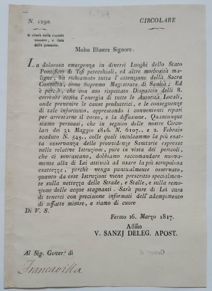Delegazione apostolica Fermo Norme sanitarie per epidemia di tifo 16 marzo 1817