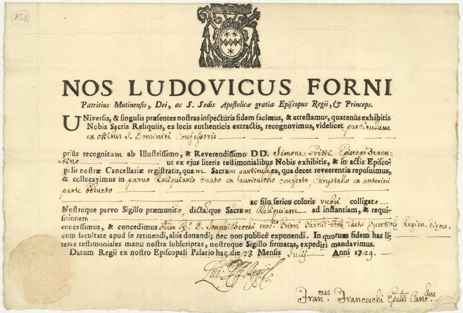 Documento, antico ed originale proveniente da importante collezione reggiana. In basso a sinistra timbro a secco