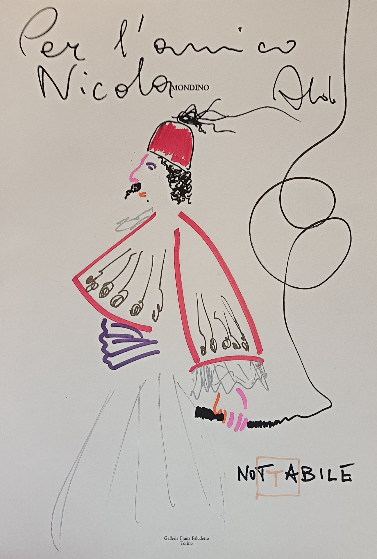 Disegno a pennarelli originale sul frontespizio del catalogo della mostra: Aldo Mondino: et in Africa ego / testo critico di Antonio Del Guercio. - Torino : Paludetto, 1986. Mostra tenutasi a Torino presso la Galleria Paludetto. Il catalogo ha avuto una tiratura di 1000 esemplari, i primi 100 contenevano un disegno dell'autore. Il disegno è dedicato "all'amico Nicola". Il soggetto rientra nella serie legata ai viaggi in Oriente che dal Marocco prosegue in Palestina, dove Mondino scopre il parallelismo tra la preghiera e l’intensità dell’attenzione nel dipingere in modo concettuale. In particolare nella preghiera esaltata nelle danze dei dervisci.