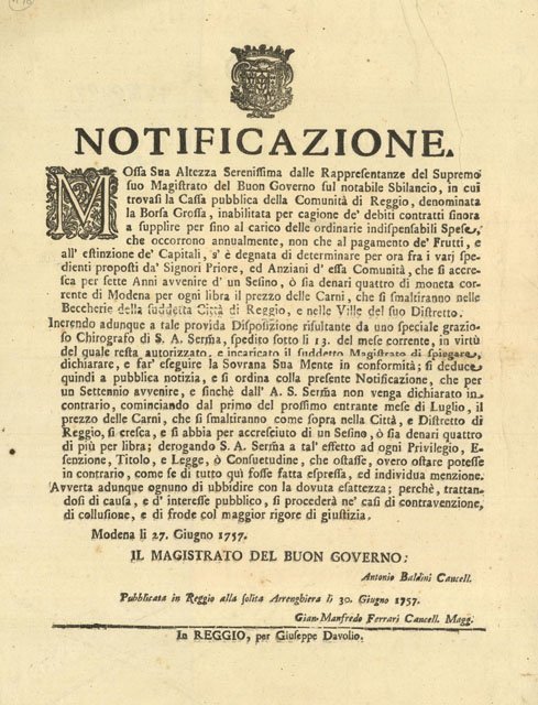 Disposizione del prezzo delle carni “…. Esi ordina colla presente Notificazione, che per un Settennio avvenire, e finchè dall’A. S. Ser-ma. Non venga dichiarato in contrario, cominciando dal primo delprossimo entrante mese di Luglio, il prezzo delle Carni, che si smaltiranno come sopra nella Città, e Distretto di reggio, si cresca, e si abbia per accresciuto di un Sesino, ò sia denari quattro più per libra…”. Modena li 27 Giugno 1757 – Il Magistrato del Buon Governo – Antonio Baldini Cancell. – Pubblicata in Reggio alla solita Arrenghiera li 30 Giugno 1757 – Gian. Manfredo Ferrari Vancell. Magg. – In Reggio, per Giuseppe Davolio