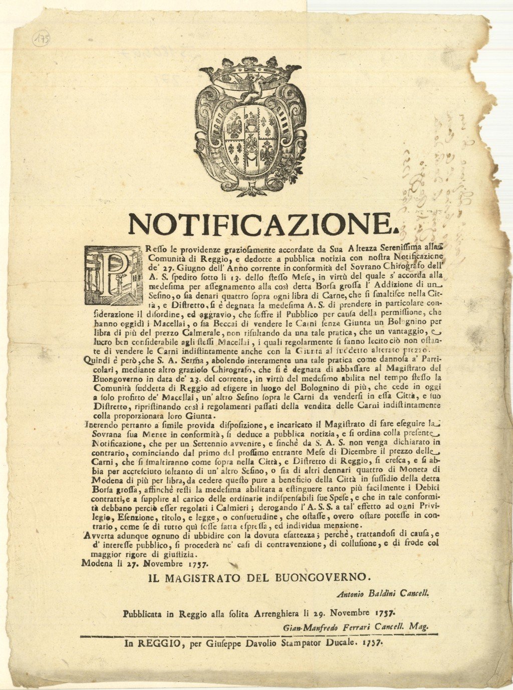 Documento, antico ed originale. proveniente da importante collezione reggiana. Disposizione del prezzo delle carni “. e si ordina colla presente Notificazione, che per un Settennio avvenire, e finchè da S. A. S. non venga dichiarato in contrario, cominciando dal primo del prossimo entrante Mese di Dicembre, il prezzo delle Carni.” Pubblicata in Reggio alla solita Arrenghiera li 29 Novembre 1757. Gian Manfredo Ferrari Cancell. Mag. – In Reggio, per Giuseppe Davolio Stampator Ducale.