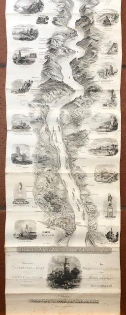 Buch in Kunsthandlung, Germany, 1850 circa. Litografia in b/n, lungo panorama verticale realizzato in più fogli, di circa 192 cm di lunghezza x 24,3 cm di larghezza. É raffigurato il corso del fiume Reno e sono incise zone montuose, pianure, città e cittadine; ai lati piccole vedute in ovale raffigurano monumenti, chiese e castelli delle principali città che lo costeggiano lungo il dispiegarsi del suo corso (Mainz, Eltville, Bieberich, Rudesheim, Iohannisberg, Rudesheim, Rheinstein, Bacherach, Boppard, Lahneck, Marksburg, Stolzenfels, Coblenz, Neuwied, Argenfels, Rheineck, Anderbach, Konigswinter, Bonn, Rosenburg, Godesberg, Cologne); al margine inferiore, fra i titoli, una vignetta della città di Oberwesel. Numerose pieghe editoriali trasversali (in orizzontale), piccole e rare macchiette di foxing, nell'insieme buono lo stato di conservazione (questa foto è dal basso e riprende solo una parte e non tutta la lunghezza con cui il foglio si dispiega).