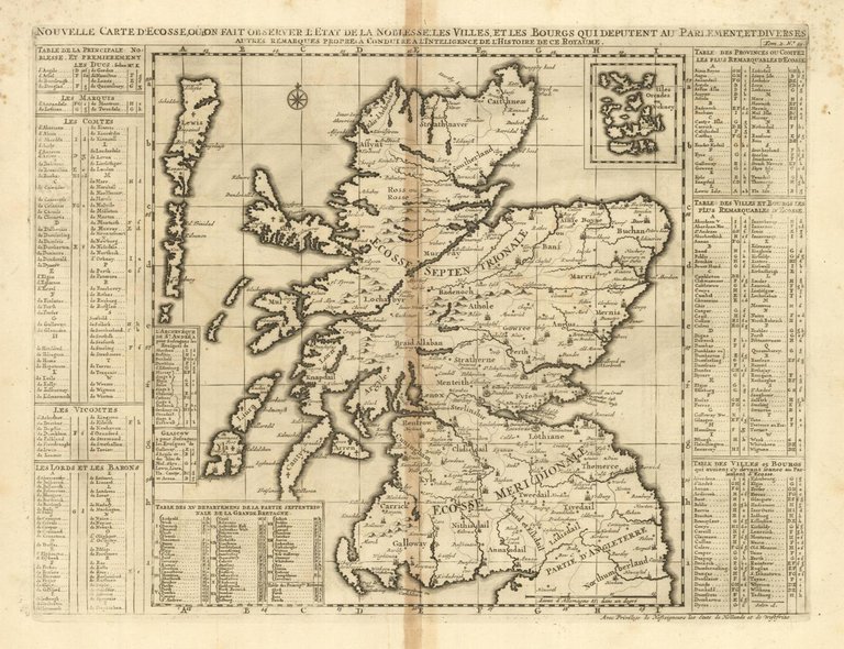 Nouvelle Carte d'Ecosse ou l'on fait observer l'Etat de la Noblesse les Villes et les Bourgs qui deputent au Parlement et Diverses autres remarques propres a Conduire a l'Inteligence de l'Histoire de ce Royaume