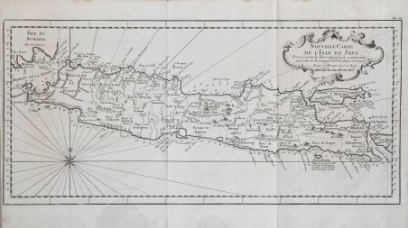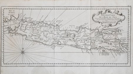 Carta geografica dell’isola di Giava, parte dell’Indonesia. Carta disegnata da Jacques Nicolas Bellin, pubblicata come tavola dell'edizione francese del 1757 di "Histoire generale des voyages, ou nouvelle collection de toutes les relations de voyages par mer et par terres" di Antoine François Prévost, più noto sotto il nome di abbé Prévost. ' La raccolta, in più volumi, è stampata per la prima volta ' A Paris: chez Didot, 1746-1753. L’opera completa - in-12° - proseguirà le pubblicazioni fino a raggiungere, nel 1789, una consistenza di 80 volumi. Colossale lavoro a carattere enciclopedico di ricerca svolto dall’Autore, cui va anche il merito di aver divulgato numerosi racconti inediti sulla scoperta dell’Australia da parte degli olandesi e i resoconti dei viaggi attraverso il Pacifico, fra cui quelli di Magellano e Schouten. ' L'opera è corredata da quasi 300 illustrazioni di popolazioni, vedute, e costumi di tutto il mondo e da 113 splendide mappe, opera di Jaques-Nicolas Bellin. Jacques-Nicolas Bellin è stato uno dei cartografi più importanti del XVIII secolo; nacque a Parigi, e fu un membro dell’Académie de Marine e della Royal Society di Londra. Nel 1721, all’età di 18 anni, fu nominato idrografo (cartografo capo) alla Marina Militare francese. Nell’agosto del 1741, divenne il primo ' Ingénieur de la Marine del Depot des cartes et plans et de la Marine ' (l’ufficio idrografico francese) e fu nominato ufficiale idrografico del Re di Francia. Durante il suo servizio gli furono commissionati i rilievi delle coste francesi prima, e successivamente quelle di tutto il mondo conosciuto. La sua produzione fu immensa e le sue carte nautiche, di grande qualità, apparvero in più edizioni oltre la fine del diciottesimo secolo. Le carte nautiche venivano vendute separatamente e recavano tutte l’inconfondibile timbro dell’ancora e la corona del Depot Generale de la Marine. Incisione in rame, in ottime condizioni. Incisione in rame, ' in ottime condizioni. Map of the island of Java, a part of Indonesia. Map drawn by Jacques Nicolas Bellin, published as a plate of the French edition of 1757 of "Histoire General des Voyages, ou nouvelle collection de toutes les relations de voyages par mer et par terre s" by Antoine François Prévost, better known under the name of abbé Prévost. The collection, in several volumes, is printed for the first time A Paris: chez Didot, 1746-1753. The complete work - in 12th - will continue the publications until it reaches, in 1789, a consistency of 80 volumes. ' A colossal encyclopedic research work carried out by the author, which also deserves credit for having published numerous unpublished stories about the discovery of Australia by the Dutch and reports of journeys across the Pacific, including those of Magellan and Schouten. The work is accompanied by nearly 300 illustrations of populations, views, and costumes from around the world and by 113 splendid maps, by Jaques-Nicolas Bellin. Bellin was one of the most important cartographers of the 18th century; he was born in Paris, and was a member of the Académie de Marine and the Royal Society of London. In 1721, at the age of 18, he was appointed hydrographer (chief cartographer) to the French Navy. In August 1741, he became the first Ingénieur de la Marine of the Depot des cartes et plans et de la Marine (the French hydrographic office) and was appointed hydrographic officer to the King of France. During his service he was commissioned to survey first the French coastline and later those of the entire known world. His output was immense, and his high-quality nautical charts appeared in multiple editions beyond the end of the 18th century. ' Copperplate, in good conditions. Cfr.