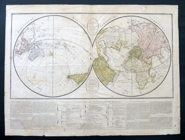 Molini Landi, Firenze, 1807. Incisa da Giuseppe Canacci (“Gius. Canacci inc.” in basso a sinistra) carta che raffigura i due emisferi, titoli entro semplici e piccoli cartigli. Esemplare con piccoli difetti della carta e un lieve uniforme ingiallimento, in coloritura coeva e in margini, nell’insieme in buono stato di conservazione.