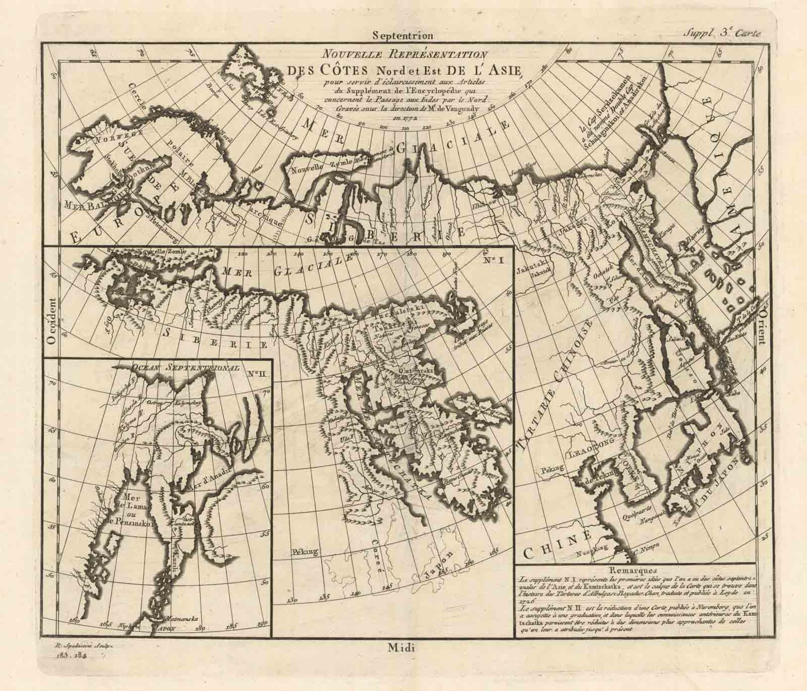 Interessante raffigurazione delle coste Nord Est dell'Asia. L'inserto I presenta la prima idea geografica delle coste settentrionali dell'Asia e della Kamchakta, mentre l'inserto II è una riduzione di una carta che era stata pubblicata a Norimberga