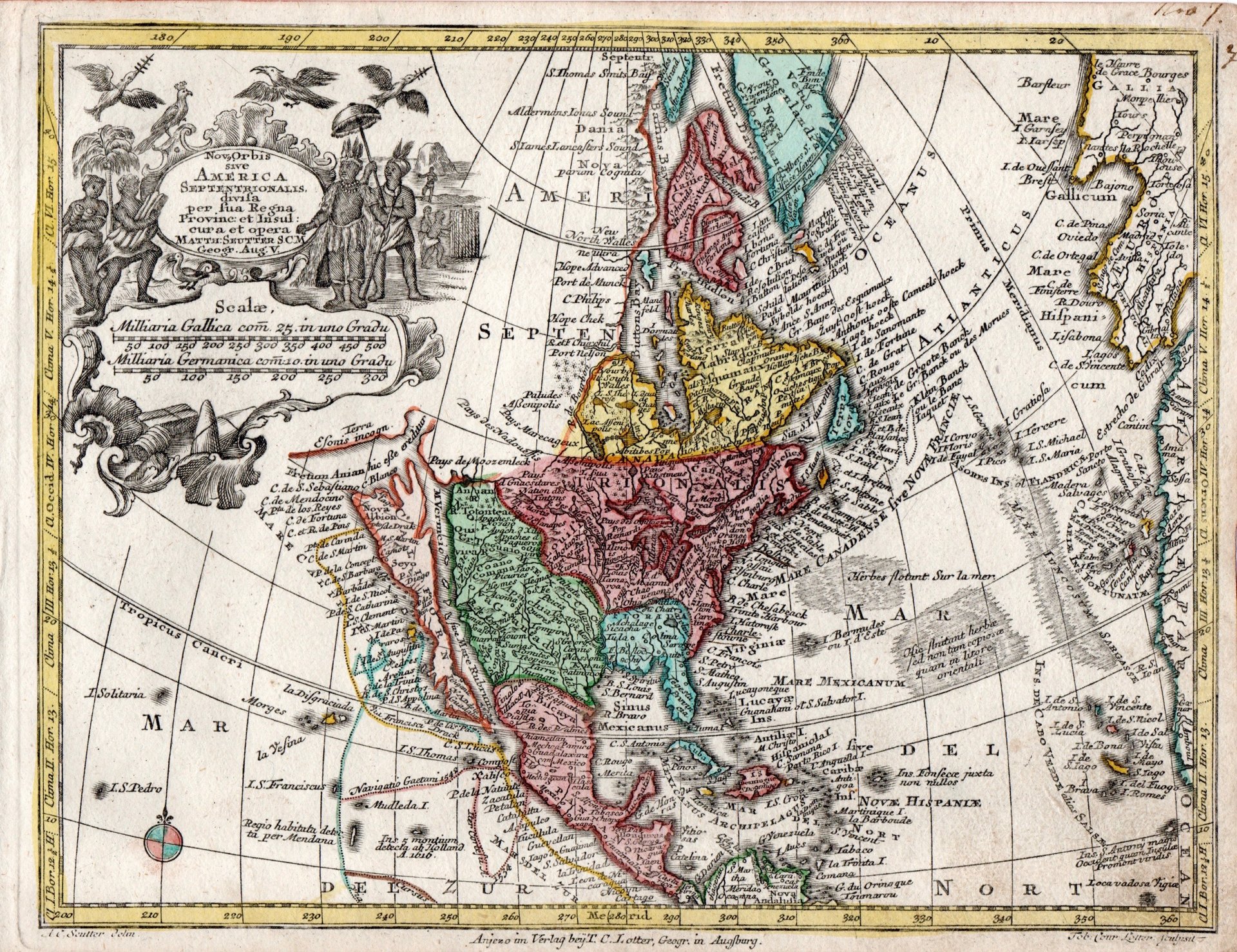 Incisione in rame, coloritura originale d'epoca, mm 200x260. Seutter, dopo un apprendistato presso Homann a Norimberga, trasferitosi ad Augsburg verso il 1720, aprì la propria attività superando il maestro sotto il profilo della bellezza: le sue carte hanno sempre colori brillanti e cartigli elaborati. Esemplare in ottimo stato di conservazione con i margini brevi su tre lati. <BR>Decorativa mappa del continente americano che raffigura la California come un'isola. Nel cartiglio elementi decorativi con i nativi americani e uccelli, racchiudono il titolo.<BR>Augsburg, Tobias Conrad Lotter, 1740. Original colour mm 200x260. California is depicted as an Island. The decorative title cartouche features native Americans and birds. <BR>California is narrowed in the center, based upon a theory advanced by Father Luis Velarde. Interesting vertical projection. Many placenames throughout.<BR>