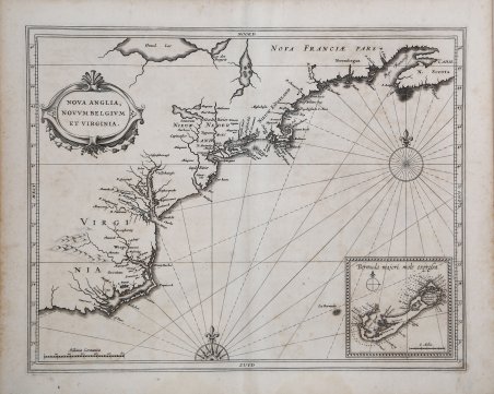Bellissimo esemplare di questa “Map of Extreme Importance” (Burden), probabilmente la più importante carta del Nord-Est e del Medio Atlantico pubblicata nella prima metà del XVII secolo. La “First printed map of New Netherlands as well as the first printed map that names New Amsterdam and Manhattan . . .” ' (Schwartz), che mostra correttamente Manhattan come un'isola. Quest'opera fondamentale colloca gli insediamenti olandesi del Nord America nel loro contesto geografico solo cinque anni dopo la fondazione di Nuova Amsterdam (New York). Sebbene sia di per sé una carta piuttosto rara, la mappa di De Laet ebbe una lunga vita editoriale grazie alle numerose edizioni di Janssonius, che ne pubblicò una copia, ingrandita, nel 1636 e aggiornandola, nel 1647. Secondo McCorkle, questa è anche la prima mappa con il nome del Massachusetts. È anche una delle prime mappe acquisibili a rappresentare i Grandi Laghi. In genere si ritiene che il "Grand Lac" sulla mappa corrisponda al Lago Superiore e il "Lac de Yroquois" al Lago Huron. Tuttavia, stante la datazione precoce della carta, sembra più probabile, anche se la forma e l'allineamento sono poco somiglianti, che rappresentino i laghi Erie e Ontario. La carta comprende anche un inserto ben dettagliato delle Bermuda, una delle prime mappe separate dell'isola. Johannes De Laet fu uno dei principali protagonisti della fondazione dei “Nuovi Paesi Bassi”: fu direttore della Compagnia olandese delle Indie occidentali, che ne sponsorizzò l'insediamento, e possedeva anche un'ampia proprietà terriera nella zona di Albany. Avrebbe quindi avuto accesso ai rilievi e alle informazioni dei coloni olandesi, il che spiega come abbia prodotto questa bella mappa in una data così precoce. “A map of extreme importance. . . Hessel Gerritsz, the author and probable engraver of the map, had been the official cartographer to the Dutch East India Company since 1617. He would have seen all the documentation and charts from the Dutch voyages into the area of the Hudson River. His depiction of the coastal area between Chesapeake Bay and Cape Cod is by far the finest yet seen. This despite the fact that he still shows the Delaware River flowing from a lake. This is descended from the so-called figurative map of Cornelis Hendrick, 1616. The map . . . exhibits signs of being familiar with the other important derivative map of the period, that of Adrian Block, 1614. This is the first occurrence of NOVVUM BELIGVM, or New Netherlands, in the title. The reason for it being referred to here as Belgium is that the majority of the backing of the Dutch West India Company was by Walloon Protestants of that region” (cf. P. Burden, Mapping of North America: A List of Printed Maps 1511-1670, n. 231). Quella di De Laet fu la prima mappa a nominare in qualsiasi forma Manhattan, Nuova Amsterdam, il fiume Nord (Hudson) e il fiume Sud (Delaware), oltre alla prima apparizione del Massachusetts (e della colonia inglese appena fondata). La mappa di De Laet apparve nella sua opera fondamentale sull'America, che è ampiamente considerata come il più importante e influente trattato sull'argomento pubblicato nel XVII secolo, il celebre ' Novus Orbis seu descriptionis Indiae occidentalis Libri XVIII ' stampato a ' Lugduni Batavorum: Elzevir, 1633. ' Terza edizione di una delle più importanti collezioni di viaggi nel Nuovo Mondo del diciassettesimo secolo, compilata dal direttore della neonata Compagnia Olandese delle Indie Occidentali, Johannes de Laet (1581-1649). Le edizioni precedenti furono pubblicate: la prima ad Anversa in olandese (1625), la seconda edizione – la prima in latino - a Leida, nel 1630, sempre dall’editore Elzevir. L’edizione del 1633 include per la prima volta quattro mappe regionali americane: "Americae sive Indiae Occidentalis", la migliore delineazione della costa occidentale che raffigura la California come una penisola e non un'isola, e fermandosi alla controversa regione del Passagg. Attractive example of a “Map of Extreme Importance” (Burden); quite possibly the most important ' map of the Northeast & Mid-Atlantic published in the first half of the 17th Century. “First printed map of New Netherlands as well as the first printed map that names New Amsterdam and Manhattan . . .” ' (Schwartz). It is also the first collectible map to correctly show Manhattan as an island. This landmark work places the Dutch North American settlements in their geographic context just five years after the founding of New Amsterdam. Though itself a scarce map, De Laet’s map had a long publishing life through the many issues of Jansson’s close re-engravings of it of 1636 and 1647. According the McCorkle, this is also the first map with the place name Massachusetts. It is also among earliest acquirable maps to represent any of the Great Lakes. ‘Grand Lac’ on the map has generally been thought to be Lake Superior, which would make ‘Lac de Yroquois’ Lake Huron. However, given the early date of the map, it seems more likely that it is Lakes Erie and Ontario represented on the map, though there is little resemblance in shape and alignment. The map also includes a well-detailed inset of Bermuda, which is one of the earliest separate maps of the island. Johannes De Laet was a principal player in the founding of New Netherlands; he was a Director of the Dutch West India Company, which sponsored its settlement, and he also owned a large tract of land in the area of Albany. He therefore would have had access to surveys and information from Dutch colonists, which explains how he produced this fine map at such an early date. Johannes De Laet's highly influential map of the East Coast of North America is a cartographic landmark, depicting the region at a time when Dutch and English regional settlements were beginning to accelerate. “A map of extreme importance. . . Hessel Gerritsz, the author and probable engraver of the map, had been the official cartographe
