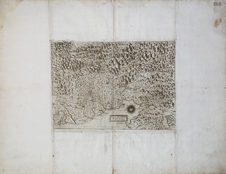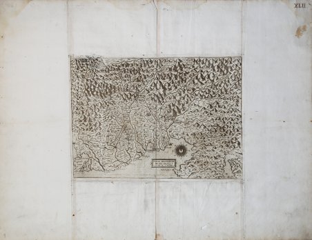 Carta anonima e priva di dati editoriali, pubblicata per la prima volta nel 1561, e attribuita da David Woodward, nel suo saggio sullâincisore veronese, a Paolo Forlani. Esemplare nel quinto stato di otto descritto da Bifolco-Ronca (2018), con la data M.D.LXIII. e la rappresentazione dellâisola di Grado. In un cartiglio rettangolare, posto nel mare, è inciso il titolo: NOVA DESCRIPTIONE DEL FRIULI M.D.LXIII. Carta priva di orientazione, scala grafica e graduazione ai margini. Prima replica in rame della carta di Giovanni Andrea Vavassore del 1550, la più antica carta a stampa dellâarea e, insieme a quella manoscritta di Giovanni Antonio Cortona (ante 1554) fonte cartografica per il Friuli. Lâopera del Vavassore mostra unâaccurata rappresentazione del rilievo montano, oltre ad unâevidente scrupolosità nella fitta riproduzione dei bacini dei tre fiumi maggiori, lâIsonzo, il Tagliamento e il Livenza. La toponomastica, però, riporta solo i grandi centri abitati, castelli, abbazie, santuari e punti strategici di chiara importanza militare ed economica. Appare palese che la mappa avesse dunque una funzione militare. âLa mappa deriva dalla carta del Vavassore, della quale rappresenta una buona replica in rame. Rispetto al modello propone numerose modifiche per quanto riguarda le linee costiere, lâidrografia e la toponomastica. Questa carta, priva di dati editoriali, appare per la prima volta nel 1561, con una prova di stampa priva della rosa dei venti e viene ristampata senza modifiche nel 1562 e nel 1563; ancora nel 1563, ne viene pubblicata unâaltra ristampa che reca però il nome di Giovanni Francesco Camocio. Lago sostiene che la tiratura del 1561 non sarebbe la prima, sulla base di alcune cancellazioni notate sulla lastra in corrispondenza della costa tra Caorle e Marano. Sono note anche una ristampa con lâindirizzo del Camocio abraso, ed una con quello di Donato Bertelli, già citata da Almagià â (cfr. Bifolco â Ronca, Cartografia e topografia italiana del XVI secolo (2018), pp. 1942-43, tav. 976, V/VIII). Magnifico esemplare, impresso su carta vergata coeva, rifilato al rame e con ampi margini bianchi aggiunti allâepoca (nel tipico stile degli atlanti compositi). In alto a destra numero in manoscritto âXLIIâ. Opera di grande rarità ed importanza. Bibliografia S. Bifolco, F. Ronca, Cartografia e topografia italiana del XVI secolo (2018), pp. 1942-43, tav. 976, V/VIII; Almagià (1948): p. 88, n. 12; Borroni Salvadori (1980): n. 47; Almagià (1929): p. 29, A-B; Bifolco-Ronca (2014): n. 59; Karrow (1993): n. 4/1.2; Lago-Rossit (1988): pp. 119-122, tavv. XXXV-XXXVII; Lago (1989): p. 254, nn. 118-119; Lago (1994): p. 326, fig. 15; Lago (2002): p. 374, figg. 369-370; Perini (1996): p. 85; Tooley (1939): nn. 224, 225, 227 & 228; Woodward (1990): n. 05.01-03; Woodward (1992): n. 14.