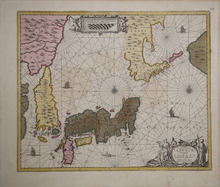 Per la prima volta pubblicata nel Atlas Novus del 1644, la carta di Giappone e Corea del Janssonius venne aggiornata nella nuova edizione, implementata da numerose mappe, del 1657. Egli colse l’opportunità di apportare alcune modifiche, basate sulle nuove esplorazioni di Maarten Vries del 1643. La forma del Giappone pertanto mutò, riducendo la larghezza dell’isola, nuovi toponimi furono inseriti e diversamente posizionati. Tuttavia sono presenti molti errori di collocazione geografica; clamorosa la descrizione di Iedo (erroneamente denominata Iede), molto a Nord. Il nostro esemplare, privo del testo al verso, deriva probabilmente da un atlante composito edito dagli eredi di Janssonius verso il 1680. Dal 1694 la lastra fu acquistata da Valck & Schenk, che sostituirono l’indirizzo di Janssonius con il loro. Joannes Janssonius, figlio dell'editore di Arnhem Jan Janssen, sposò Elisabeth Hondius, figlia di Jodocus Hondius, ad Amsterdam nel 1612. Dopo il suo matrimonio, si stabilì in questa città come libraio ed editore di materiale cartografico. Nel 1618 si stabilì ad Amsterdam accanto alla libreria di Willem Jansz. Blaeu, entrando in una seria competizione. Le sue attività non riguardavano solo la pubblicazione di atlanti e libri, ma anche di mappe singole e un vasto commercio di libri con filiali a Francoforte, Danzica, Stoccolma, Copenaghen, Berlino, Koningsbergen, Ginevra e Lione. Nel 1631 iniziò a pubblicare atlanti insieme a Henricus Hondius. Nei primi anni 1640 Henricus Hondius lasciò l'attività di pubblicazione di atlanti completamente a Janssonius. La concorrenza con Joan Blaeu, figlio e successore di Willem, nella produzione di atlanti spinse Janssonius ad ampliare il suo ' Atlas Novus ' finalmente in un'opera di sei volumi, in cui furono inseriti un atlante marino e un atlante del Vecchio Mondo. Dopo la morte di Joannes Janssonius, il negozio e la casa editrice furono continuati dagli eredi sotto la direzione di Johannes van Waesbergen (c. 1616-1681), genero di Joannes Janssonius. Le matrici degli atlanti di Janssonius furono in seguito vendute a Schenk e Valck. “Janssonius's work resembles a navigation chart due to the rhumb lines and compass roses it contains. The mileage chart gives the detail on the increasing scale of the Mercator projection. Campbell (1967) writes that it was based on the chart "compiled by Maerten de Vries on his voyage of 1643" and goes on to explain that the depiction of Staten Eyland and Compagnies Land was a greatly exaggerated depiction of two of the Kuril islands. Also, Hokkaid?, here shown as Landt van Eso, appears to be connected to the Asian continent. This map of Japan appears for the first time in the third volume of the German language Novus Atlas and was later incorporated in his Atlas Maior from 1675. Janssonius died in 1664, and his heirs continued the business until 1676 when the atlas inventory was sold to Abraham Wolfgang along with some of the copperplates which were later sold on to Schenk and Valck. A second auction of the remaining copperplates took place in 1694. It is not certain exactly when Schenk and Valck acquired the copperplate for this map, the rough estimated date being c.1700. Schenk and Valck erased Janssonius's imprint and replaced it with their own. The map was then sold either loose or for inclusion in a number of composite atlases over the next three or four decades." (Hubbard "Japoniae Insulae – The Mapping of Japan", p. 203). Incisione in rame, magnifica coloritura coeva, in ottimo stato di conservazione. ' Bibliografia: Hubbard "Japoniae Insulae – The Mapping of Japan", pp. 203-204, n. 30; Walter “Japan a Cartographic vision”, p. 193, n. 57; Cortazzi p. 70. Showing Japan and part of China. First published in 1644 in Janssonius' Novus Atlas. From 1657 Janssonius (Jan Jansen) supplemented the folio-edition of his atlas with several maps. He took the opportunity to enlarge the scale of this new map of Japan. Older maps depicted Ezo much larger than it is after Vries, in 1643, mistook Kunashiri and Urup to be parts of Ezo. This map shows Urup, which Vries called Compagnijs Landt, to be much larger than it was depicted before. Jansonius used the additional space to enlarge the scale and add placenames. However, he made many mistakes in the placenames and depicted many places at a wrong position, for example he called Iedo Iede and placed it to far to the north. This example, printed without text, was very likely included in an atlas published by the heirs of Janssonius towards 1680. In 1694 the plate was bought by Valck & Shenk, who put their address on it. Joannes Janssonius (Arnhem, 1588-1664), son of the Arnhem publisher Jan Janssen, married Elisabeth Hondius, daughter of Jodocus Hondius, in Amsterdam in 1612. After his marriage, he settled down in this town as a bookseller and publisher of cartographic material. In 1618 he established himself in Amsterdam next door to Blaeu’s book shop. He entered into serious competition with Willem Jansz. Blaeu. His activities not only concerned the publication of atlases and books, but also of single maps and an extensive book trade with branches in Frankfurt, Danzig, Stockholm, Copenhagen, Berlin, Koningsbergen, Geneva, and Lyon. In 1631 he began publishing atlases together with Henricus Hondius. In the early 1640s Henricus Hondius left the atlas publishing business completely to Janssonius. Competition with Joan Blaeu, Willem’s son and successor, in atlas production prompted Janssonius to enlarge his ' Atlas Novus ' finally into a work of six volumes, into which a sea atlas and an atlas of the Old World were inserted. After the death of Joannes Janssonius, the shop and publishing firm were continued by the heirs under the direction of Johannes van Waesbergen (c. 1616-1681), son-in-law of Joannes Janssonius. The copperplates from Janssonius’s atlases were afterwards sold to Schenk and Valck. “Janssonius's work resembles a navigation chart due to th