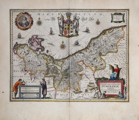 Decorativa e importante mappa decorativa del Ducato di Pomerania, che mostra città, contee, contee e fiumi. Questo esemplare proviene dall'atlante Mercator/Hondius/Jansson Hondius Nouvel Atlas. ' La mappa mostra tutta la Pomerania e l'isola di Rügen; contrassegnata con una rete di acqua e scultura di terra e 600 villaggi contrassegnati Pomorania e circa 100 di Danzica Pomerania, Wielkopolski, il Neumark, Mark Wkrzaskiej e Meclemburgo, così come i confini del ducato e paesi vicini. Numerose le decorazioni che ornano la mappa, rendendola particolarmente piacevole. Tra le altre segnaliamo il cartiglio araldico posto nel Mar Baltico - con uno scudo contenente nove stemmi della provincia del Ducato di Pomerania - una medaglia con il ritratto del principe Boguslaw XIV, tre rose dei venti con lossodromie, quattro velieri e un mostro marino. ' Johannes Janssonius, figlio dell'editore di Arnhem Jan Janssen, sposò Elisabeth Hondius, figlia di Jodocus Hondius, ad Amsterdam nel 1612. Dopo il suo matrimonio, si stabilì in questa città come libraio ed editore di materiale cartografico. Nel 1618 si stabilì ad Amsterdam accanto alla libreria di Willem Jansz. Blaeu, entrando in una seria competizione. Le sue attività non riguardavano solo la pubblicazione di atlanti e libri, ma anche di mappe singole e un vasto commercio di libri con filiali a Francoforte, Danzica, Stoccolma, Copenaghen, Berlino, Koningsbergen, Ginevra e Lione. Nel 1631 iniziò a pubblicare atlanti insieme a Henricus Hondius. Nei primi anni 1640 Henricus Hondius lasciò l'attività di pubblicazione di atlanti completamente a Janssonius. La concorrenza con Joan Blaeu, figlio e successore di Willem, nella produzione di atlanti spinse Janssonius ad ampliare il suo Atlas Novus finalmente in un'opera di sei volumi, in cui furono inseriti un atlante marino e un atlante del Vecchio Mondo. Dopo la morte di Joannes Janssonius, il negozio e la casa editrice furono continuati dagli eredi sotto la direzione di Johannes van Waesbergen (c. 1616-1681), genero di Joannes Janssonius. Le matrici degli atlanti di Janssonius furono in seguito vendute a Schenk e Valck. Acquaforte con bella colorazione originale, ottime condizioni. Decorative early map of the Duchy of Pomerania, showing towns, counties, shires and rivers. This example from is the Mercator/Hondius/Jansson atlas Hondius Nouvel Atlas. The map shows all of Pomerania and the island Rügen. On the map marked with a network of water and sculpture of land and 600 villages marked Pomoranian and about 100 of Gdansk Pomerania, Wielkopolski, the Neumark, Mark Wkrza?skiej and Mecklenburg, as well as the borders of the duchy and neighbouring countries. It is highly decorated: title cartouche with five figures and fruit, scale with two figures, a Baltic heraldic cartouche with a shield containing nine coats of arms of the Duchy of Pomerania province, a portrait medalion of Prince Boguslaw XIV, three compass roses with rhumb lines, four sailing ships and a solitary sea monster. Johannes Janssonius (Arnhem, 1588-1664), son of the Arnhem publisher Jan Janssen, married Elisabeth Hondius, daughter of Jodocus Hondius, in Amsterdam in 1612. After his marriage, he settled down in this town as a bookseller and publisher of cartographic material. In 1618 he established himself in Amsterdam next door to Blaeu’s book shop. He entered into serious competition with Willem Jansz. Blaeu. His activities not only concerned the publication of atlases and books, but also of single maps and an extensive book trade with branches in Frankfurt, Danzig, Stockholm, Copenhagen, Berlin, Koningsbergen, Geneva, and Lyon. In 1631 he began publishing atlases together with Henricus Hondius. In the early 1640s Henricus Hondius left the atlas publishing business completely to Janssonius. Competition with Joan Blaeu, Willem’s son and successor, in atlas production prompted Janssonius to enlarge his Atlas Novus finally into a work of six volumes, into which a sea atlas and an atlas of the Old World were inserted. After the death of Joannes Janssonius, the shop and publishing firm were continued by the heirs under the direction of Johannes van Waesbergen (c. 1616-1681), son-in-law of Joannes Janssonius. The copperplates from Janssonius’s atlases were afterwards sold to Schenk and Valck. Copperplate with fine original colouring, very good condition. Cfr.