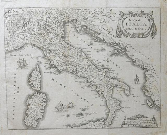 Francoforte, 1680 circa. In Topographia Italiae, stampata a Francoforte in diverse edizioni a partire dal 1640, la carta ha avuto numerose ristampe, sino al 1688. Incisione in rame, b/n, cm 28,5 x 36,5 (alla lastra). Esistono esemplari quasi uguali, con il titolo Italia entro cartiglio che si differenzia da quello del Merian per la presenza di un fiocchetto che pende verso il basso. Titolo in alto, a destra, entro cartiglio con decori e figure. In basso, a destra, entro cartiglio, 2 scale grafiche di miglia italiane e tedesche; margine non graduato, senza reticolato. Tutti gli elementi della carta, nella configurazione generale, derivano dalla Italia Nuova del Magini del 1608. Praticamente identica alla presente, salvo nelle dimensioni, sarà la successiva carta di Giovanni Enrico Pflaumern edita ad Augsburg nel 1649 e contenuta nel Mercurius Italicus, edito ad Augsburg, della quale, a sua volta, ci sono state ristampe nel 1650 e di cui esistono successivi esemplari quasi identici relativamente all’aspetto geografico, con lievi differenze nelle dimensioni e nel cartiglio. Mattheo Merian (Basilea 1593 – 1650) fu un famoso incisore svizzero, istruitosi a Zurigo e trasferitosi poi a Francoforte, dove incontrò Theodore de Bry, divenendone successivamente suo genero. Trascorse la maggior parte della sua vita lavorativa a Francoforte e, insieme al geografo Tedesco Martin Zeiller (1589 - 1661), e dopo con suo figlio, produsse la Topographia, costituita da 21 volumi, incluso un alto numero di piante di città, mappe degli stati e un mappamondo. Quest’opera, di notevole successo, conobbe molte edizioni. Si interessò anche, e completò, le ultime parti e le edizioni dei Grand Voyages e dei Petits Voyages, inaugurati dal De Bry nel 1590. Esemplare un po' ingiallito e con una impressione un po’ stanca, discreto. .