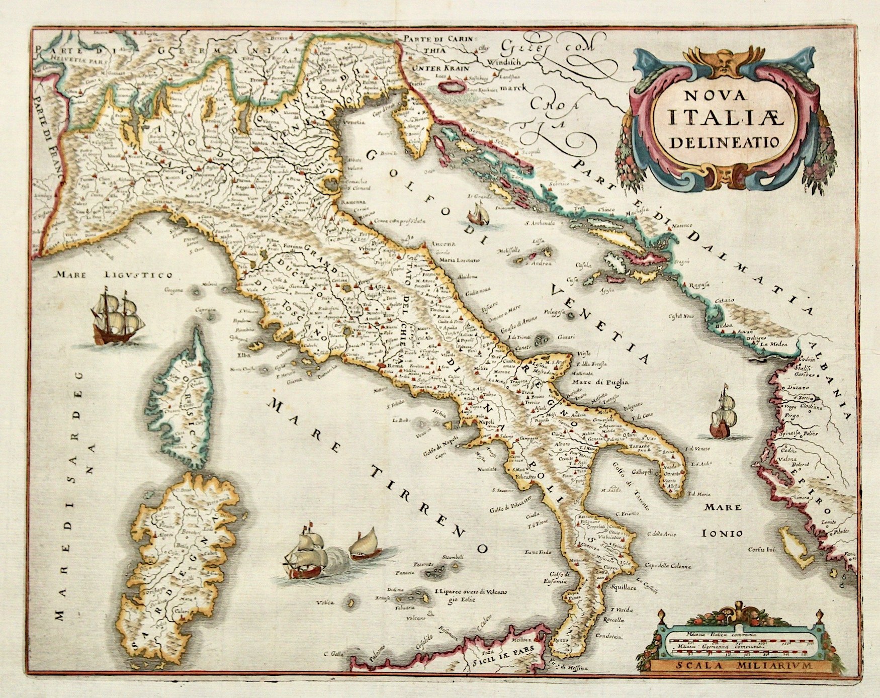 Incisione in rame, mm 280x365, dipinta a mano. Tratta da "Neuwe Archontologia cosmica" di Johann Gottfried. Ottimo esemplare. Copper engraving, mm 280x365, colored. From "Neuwe Archontologia cosmica" by Johann Gottfried. Enriched with figure title-cartouche, fish and ships. Map after Blaeu. Very good condition.<BR>