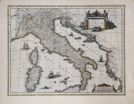 Secondo stato, con i bordi tagliati e stampato dalla tipografia Blaeu, della celebre carta della penisola di Jodocus Hondius Jr. basata sulla carta murale della penisola di Giovanni Antonio Magini (1608). Titolo in alto a destra, entro cartiglio costituito da tavola sorretta da figure allegoriche con sottostante la lupa che allatta Romolo e Remo; in basso a destra, entro altro cartiglio, due scale grafiche di miglia italiane e germaniche; nel mare ci sono navi e vascelli e la testa emergente di un mostro marino. Carta con reticolato e con margine graduato su tutto il perimetro. Il primo stato di questa carta fu pubblicato da Jodocus Hondius jr (prima del 1629) ed era incorniciato su tutti i lati da bordi decorativi. Dopo la morte di Jodocus Hondius (nel 1629), la lastra di rame passò nelle mani di Willem Janszoon Blaeu, che ristampò la carta tagliando i bordi decorativi e rimuovendo la dedica e la firma di Jodocus Hondius. Questa carta ridotta appare nella seconda edizione dell'Appendix di Blaeu del 1631 e negli atlanti successivi della famiglia Blaeu. Tutti gli elementi della carta derivano dalla "Italia Nuova" del Magini del 1608, prototipo di tutte le carte olandesi del XVI secolo. Magnifica prova, impressa su carta coeva e finemente colorata in epoca, in ottimo stato di conservazione. Bibliografia G. Schilder, Monumenta Cartographica Neerlandica, vol. VI, pp. 386-387, n. 96.2. Second state, with trimmed edges and printed by Blaeu printing house, of Jodocus Hondius Jr.'s famous map of the peninsula based on Giovanni Antonio Magini's wall map (1608). Title at upper right, within cartouche consisting of table supported by allegorical figures with the she-wolf suckling Romulus and Remus below; at lower right, within another cartouche, two graphic scales of Italian and Germanic miles; in the sea are ships and vessels and the emerging head of a sea monster. The first state of this map was published by Jodocus Hondius jr (before 1629) and was framed on all sides by decorative borders. After the death of Jodocus Hondius (in 1629), the copperplate passed into the hands of Willem Janszoon Blaeu, who reprinted the paper by cutting off the decorative borders and removing the dedication and signature of Jodocus Hondius. This reduced map appears in the second edition of Blaeu's Appendix of 1631 and in later atlases of the Blaeu family. All elements of the map are derived from Magini's 1608 "Italia Nuova" the prototype for all 16th-century Dutch maps. Magnificent proof, printed on contemporary paper and finely colored at the time, in excellent condition. Bibliografia G. Schilder, Monumenta Cartographica Neerlandica, vol. VI, pp. 386-387, n. 96.2. Cfr.