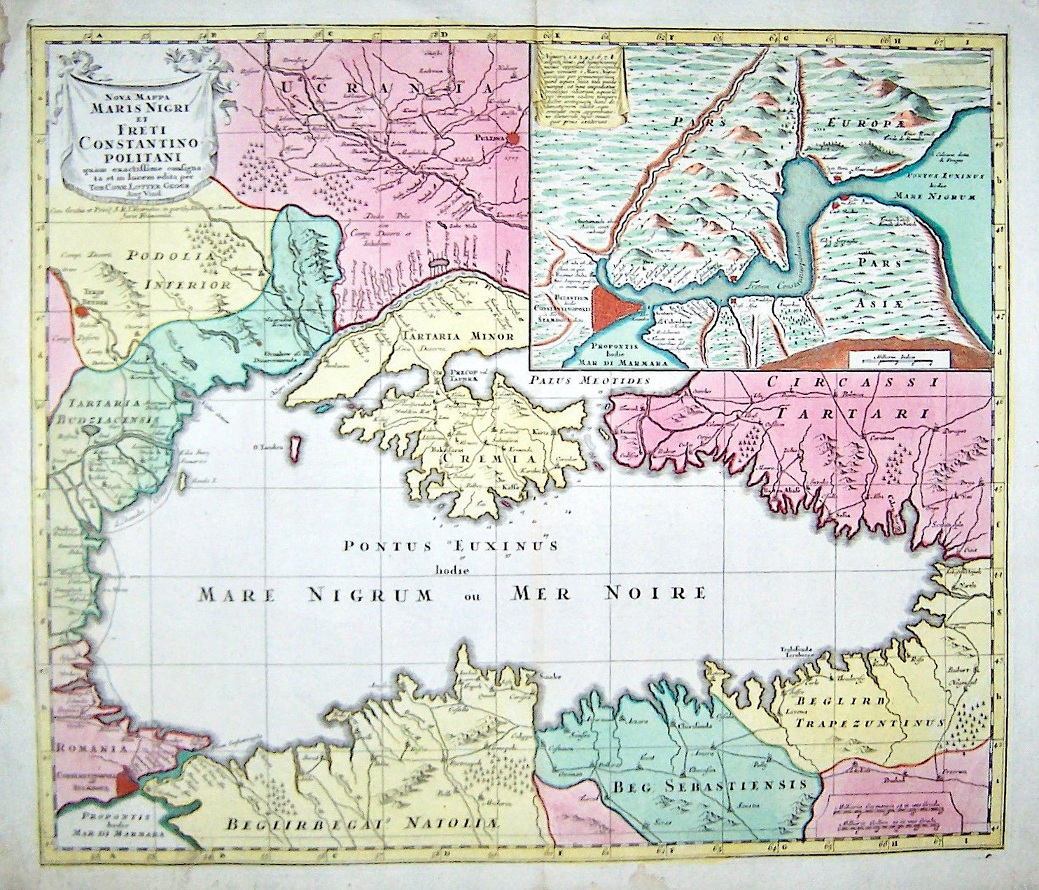 Incisione in rame, splendida coloritura originale d'epoca, mm. 500x585. La parte superiore destra, entro riquadro, è un ingrandimento della zona del Bosforo. Seutter, dopo un apprendistato presso Homann a Norimberga, trasferitosi ad Augsburg verso il 1720, aprì la propria attività superando esteticamente il maestro: le sue carte hanno sempre colori brillanti e cartigli elaborati. La sua attività fu rilevata da Lotter. Esemplare molto bello su carta forte con buoni margini che presenta qualche traccia d'umido sui margini senza intaccare la parte incisa.