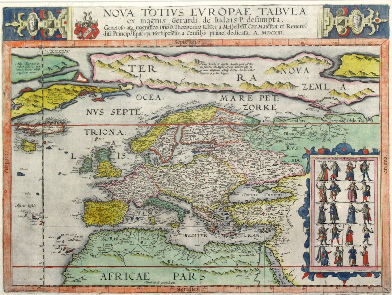 Incisione in rame, mm 338x450, colorata d'epoca, firmata in lastra in basso "formis hered? Gerardi de Jode". Rarissima carta pubblicata solo in questa edizione del raro "Speculum Orbis Terrae", curato dal figlio Cornelio con alcune varianti nel testo e nel numero delle tavole, seconda edizione dell'atlante. Nella prima edizione del 1578 Gerard aveva inserito una diversa carta, sostituita da Cornelio con questa più decorativa, che in basso entro riquadro presenta dieci coppie di abitanti di vari paesi europei nell'abito tradizionale. De Jode (1509-1591) fu cartografo, incisore, stampatore, editore attivo ad Anversa a metà del Cinquecento, nello stesso periodo di Ortelio; la vicissitudini della vita non gli permisero di avere il medesimo successo e no fu in grado di uguagliare l'importanza dell'attività economica del rivale. Questo fece però si che le sue carte siano diventate decisamente più rare. Esemplare perfetto in rara coloritura antica. Koeman, Atlantes Neerlandici, II, Jod 2, pag 210.<BR>Copper engraving, mm 338x450, original color, signed "formis hered? Gerardi de Jode" in the plate. A large inset includes 20 costumed figures, representing the dress of various European inhabitants. The map has been published only in this second edition of the atlas.<BR>Gerard De Jode was a competitor of Ortelius, active in the same period; but his atlas 'Speculum Orbis Terrarum' did not enjoy the same commercial success as Ortelius and now-a-days his maps are much rarer than Ortelius' ones.<BR>After the death of Gerard in 1591, the business was carried on by his widow and his son Cornelis, who re-issued the Speculum in 1593, most plates were newly engraved, and therefore making those of the first edition extremely rare. A perfect example in its original antique color. Koeman, Atlantes Neerlandici, II, Jod 2, pag 210. <BR>