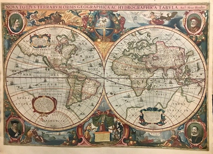 Carta geografica originale (cm. 54,5x38 più margini bianchi). Splendida coloritura coeva all’acquarello. Testo in lingua latina al verso. Esemplare in eccellente stato di conservazione. Primo stato di quattro. Molto rara. Splendido mappamondo in due emisferi opera di uno dei più celebri cartografi di tutti i tempi, icona dell’epoca d’oro della cartografia olandese. La carta è decorata nei quattro angoli con i ritratti di Tolomeo, Hondius, Mercator e Giulio Cesare. Nella parte superiore è presente il globo celeste abbellito con festoni mentre, nella parte inferiore, la figura allegorica dell’Europa riceve doni dall’Africa, dall’Asia e dall’America, rappresentazione che riflette il dominio delle potenze marittime europee all’epoca. Ai lati sono raffigurati come di consueto i quatto elementi, Fuoco, Aria, Terra e Acqua. Nei due emisferi si possono notare inoltre tre piccoli pannelli, uno dei quali descrive la scoperta dell’America da parte di Cristoforo Colombo.Per i dettagli geografici Hondius seguì John Speed ed i suoi contemporanei e anch’egli presenta la California come un’isola. Le innovazioni riguardano in particolare la costa settentrionale dell’Australia che si estende verso la Nuova Guinea e un nuovo disegno del nord-est del Canada con l’Isola di Baffin (indicata come ‘Queen Anne’s forland’) ora mostrata completamente circondata dal mare. In America meridionale, lo Stretto di Le Maire appare adesso ad est dello Stretto di Magellano. Va considerato che lo Stretto di Le Maire era stato scoperto solo quindici anni prima la pubblicazione di questa carta. Cfr. Shirley, ‘The mapping of the world’, n. 336.