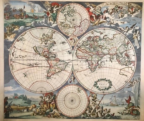 Carta geografica originale (cm. 56,5x48,5 più margini bianchi). Splendida coloritura coeva all’acquarello. Reintegrazione della parte inferiore del margine bianco sinistro, peraltro esemplare in eccellente stato di conservazione. Primo stato di due. Molto rara. Mappamondo in due emisferi assai decorativo basato sulla mappa del mondo marittimo di Frederick De Wit del 1668. Con due emisferi e due piccole mappe polari negli inserti. Decorato con grandi e vivaci scene raffiguranti allegoricamente i quattro elementi: fuoco, terra, acqua e aria. Il fuoco è rappresentato con guerra e distruzione; l’aria con il Regno dei cieli, le costellazioni e alcuni uccelli; la terra mediante l’agricoltura e l’allevamento; l'acqua con diverse imbarcazioni e una balena zampillante.Justus Danckerts pubblicò due mappamondi entrambi basati sulla mappa del mondo marittimo di Frederick de Wit. Per questa prima tiratura del 1680, Danckerts adottò pressoché senza variazioni sia la geografia che gli elementi decorativi di De Wit.Cfr. Shirley, ‘The mapping of the world’, n. 495.