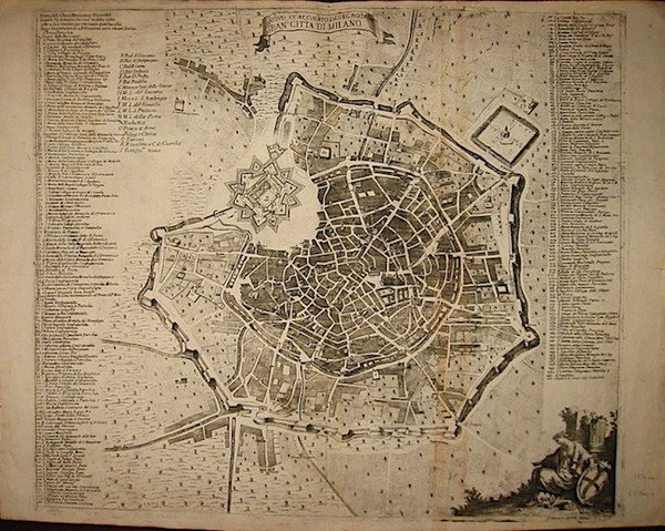 Incisione originale su rame (cm. 55,5x48 più margini). Alcune minuscole imperfezioni ai margini bianchi e lieve brunitura lungo una piegatura editoriale, altrimenti esemplare in ottimo stato di conservazione. Ai due lati della parte incisa, una legenda con 252 rimandi agli edifici notabili della città. Rarissima tiratura di questa pianta - originariamente pubblicata da Federico Agnelli, padre di Francesco, tra il 1656 ed il 1657 - che presenta alcune modifiche tra cui l’aggiunta di tre numeri alla legenda, del bel cartiglio allegorico e del’imprint ‘francesco agnelli forma’ in basso a destra.