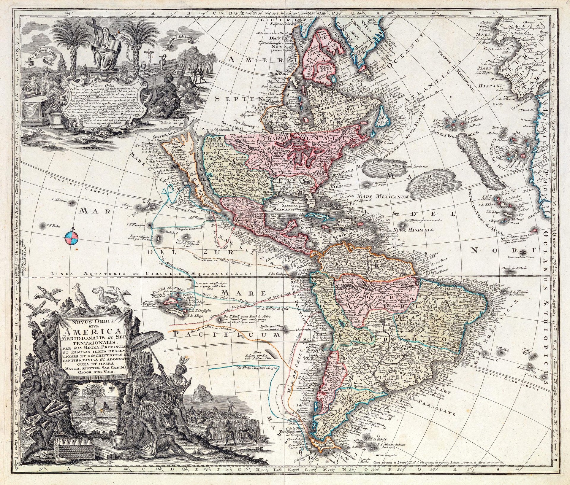 Incisione in rame, coloritura originale d'epoca, con due ricchi e fascinosi cartigli figurati in bianco nero a sinistra. Mm 500x580. Seutter, dopo un apprendistato presso Homann a Norimberga, trasferitosi ad Augsburg verso il 1710, aprì la propria attività superando il maestro sotto il profilo della bellezza: le sue carte hanno sempre colori brillanti e cartigli elaborati. Bell'esemplare, piccolo strappo restaurato professionalmente alla piega centrale.<BR>Copperplate, original colour. Mm 500x580. Good condfition. Seutter, one of the most celebrated eighteenth century German mapmakers, after having worked with Homann in Nuremberg, started his own business in Augsburg around 1710. His maps always have elaborate cartouches and are very decorative and printed on good paper; small professionally restored tear at centre fold. <BR>