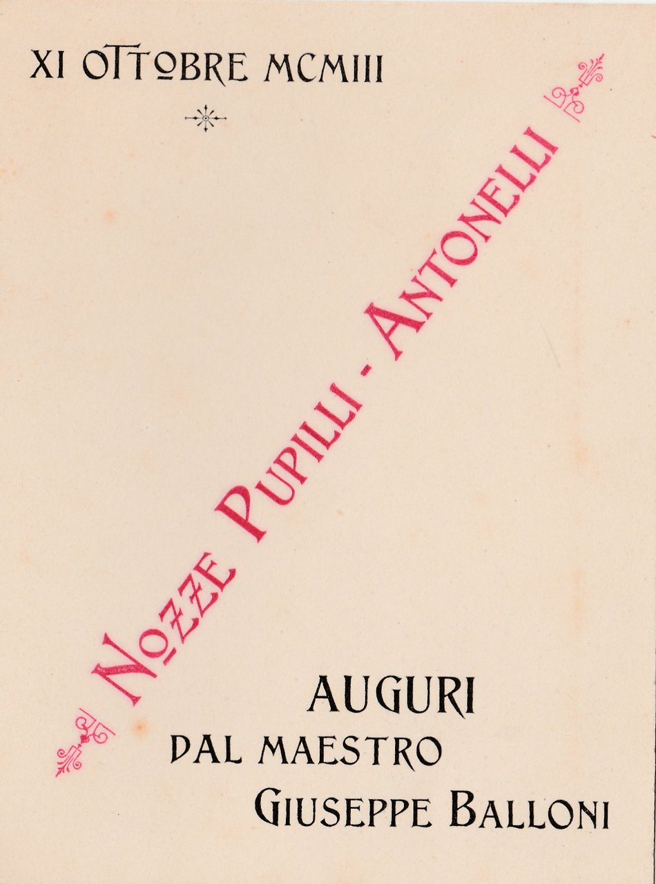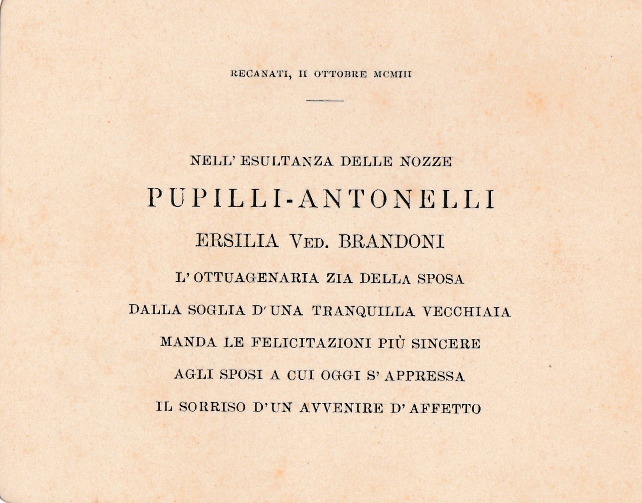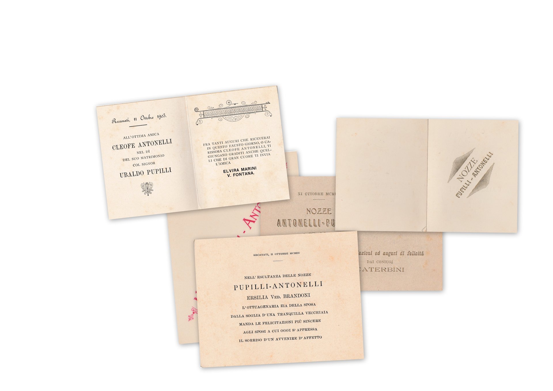 NOZZE CLEOFE ANTONELLI E UBALDO PUPILLI RECANATI 11 OTTOBRE 1903 LOTTO COSTITUITO DA N.1 BIGLIETTINO DI AUGURI RIPIEGATO CON DEDICA ALL'INTERNO DELL'AMICA ELVIRA MARINI V. ANA DIMENSIONI CM 11,5 X 9,3 N.1 BIGLIETTINO DI AUGURI CON ANGOLI ARROTONDATI DELL'ORDINARIA VIA DELLA SPOSA ERSILIA VED. BRANDONI DIMENSIONI CM 9 X 11,5 N.1 BIGLIETTINO DI AUGURI DEI CONIUGI CATERBETTI DIMENSIONI CM 9 X 14 N. 1 BIGLIETTINO DI AUGURI DEL MAESTRO GIUSEPPE ALLONI DIMENSIONI CM 13,5 X 10 6399 Lotto costituito da: n.1 bigliettino di auguri ripiegato con dedica all'interno dell'amica Elvira Marini V. Fontana dimensioni cm 11,5 x 9,3 n.1 bigliettino di auguri con angoli arrotondati dell'ordinaria via della sposa Ersilia Ved. Brandoni dimensioni cm 9 x 11,5 n.1 bigliettino di auguri dei coniugi Caterbetti dimensioni cm 9 x 14 n. 1 bigliettino di auguri del maestro giuseppe Balloni dimensioni cm 13,5 x 10
