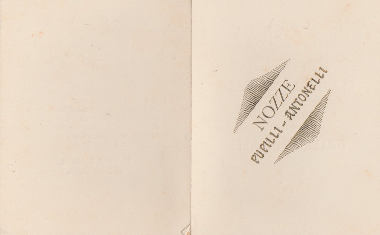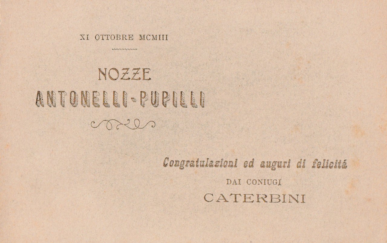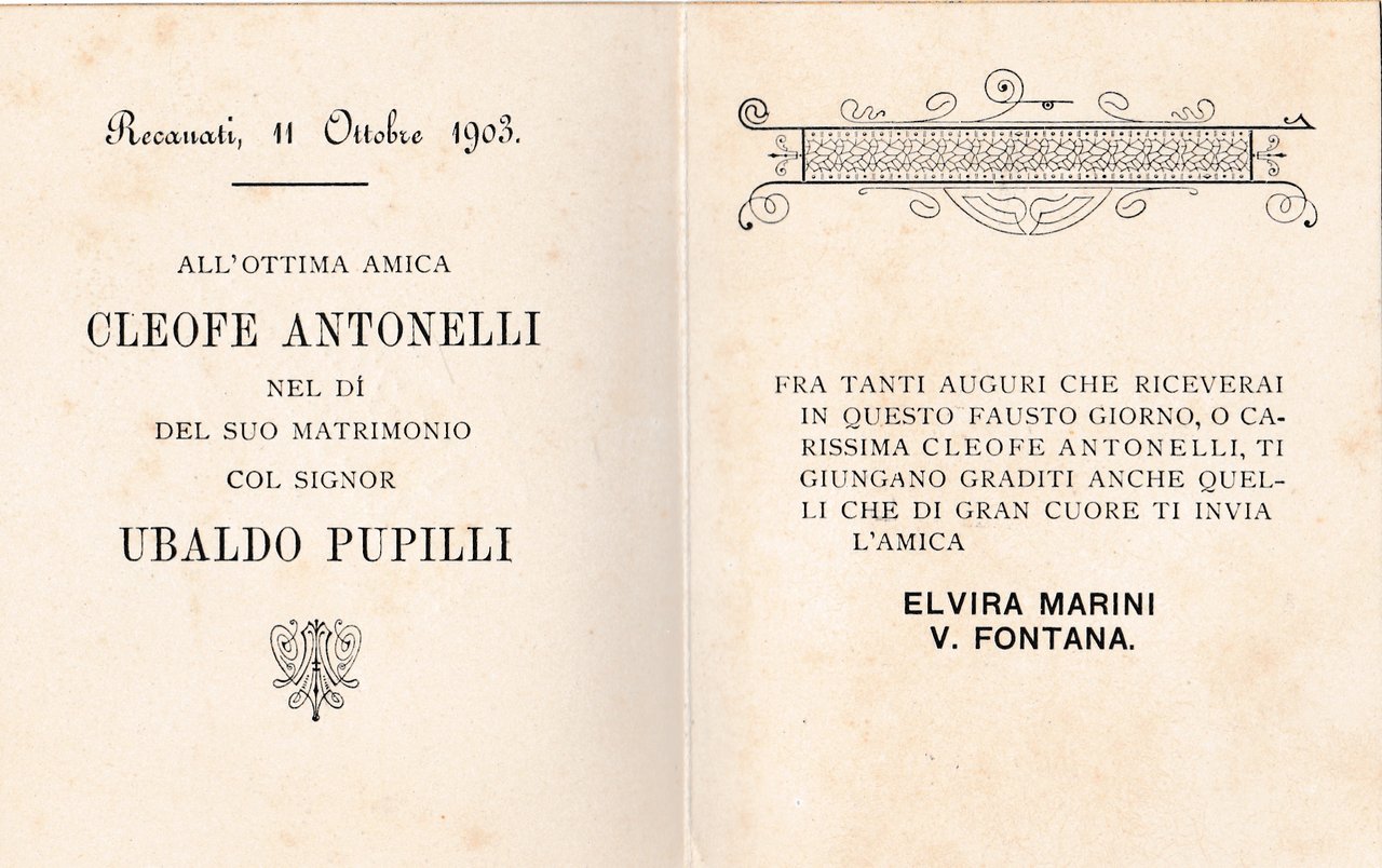 NOZZE CLEOFE ANTONELLI E UBALDO PUPILLI RECANATI 11 OTTOBRE 1903 LOTTO COSTITUITO DA N.1 BIGLIETTINO DI AUGURI RIPIEGATO CON DEDICA ALL'INTERNO DELL'AMICA ELVIRA MARINI V. ANA DIMENSIONI CM 11,5 X 9,3 N.1 BIGLIETTINO DI AUGURI CON ANGOLI ARROTONDATI DELL'ORDINARIA VIA DELLA SPOSA ERSILIA VED. BRANDONI DIMENSIONI CM 9 X 11,5 N.1 BIGLIETTINO DI AUGURI DEI CONIUGI CATERBETTI DIMENSIONI CM 9 X 14 N. 1 BIGLIETTINO DI AUGURI DEL MAESTRO GIUSEPPE ALLONI DIMENSIONI CM 13,5 X 10 6399 Lotto costituito da: n.1 bigliettino di auguri ripiegato con dedica all'interno dell'amica Elvira Marini V. Fontana dimensioni cm 11,5 x 9,3 n.1 bigliettino di auguri con angoli arrotondati dell'ordinaria via della sposa Ersilia Ved. Brandoni dimensioni cm 9 x 11,5 n.1 bigliettino di auguri dei coniugi Caterbetti dimensioni cm 9 x 14 n. 1 bigliettino di auguri del maestro giuseppe Balloni dimensioni cm 13,5 x 10