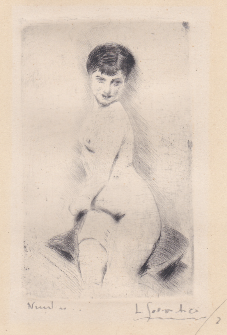 Piccola lastra che pare cogliere dal vero, grazie all'immediatezza della puntasecca, lo sguardo malizioso della modella. Il cuscino scuro sul quale la donna è seduta e la folta chioma scura chiudono la luminosa figura in una sorta di cornice. Firma e titolo a matita nel margine inferiore: Nudino...L Selvatico. Impressione eccellente impressa su carta spessa color avorio, ampi margini. Perfetto stato di conservazione, minime tracce di vecchio montaggio.