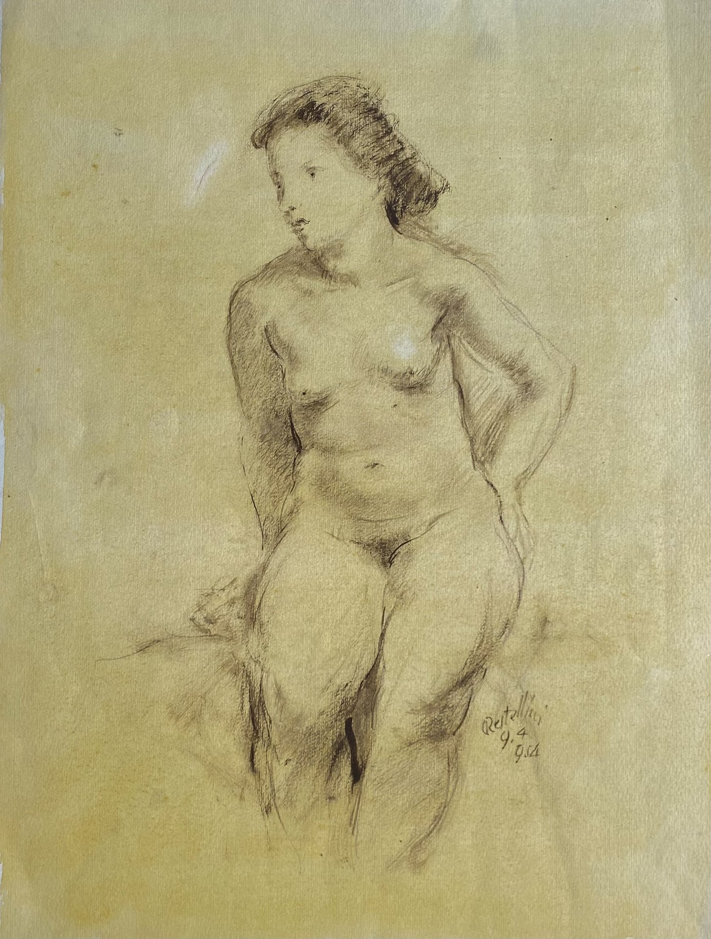 Tipico esempio della produzione del maestro nel quale il tratto grafico risente del linguaggio pittorico. La linea è franta e spezzata, la materia diluita e sfumata. Studio dal vero della modella seduta. Acquerello e gessetto bruno su carta preparata color giallo oro. Nel foglio frammento di filigrana Fabriano. Firma e data in basso a destra: 9.4.954.