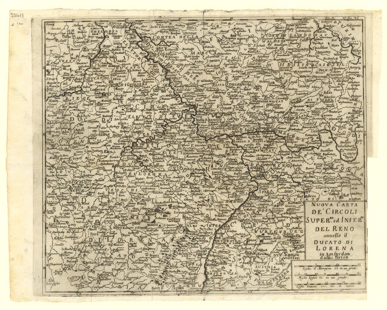 Incisione, antica ed originale, raffigurante la carta geografica dell'Alto e Basso Reno. Inserita nella rara edizione dell'opera "Lo Stato Presente di tutti i Paesi e Popoli del Mondo, naturale, politico, e morale." vol. X, stampata a Napoli