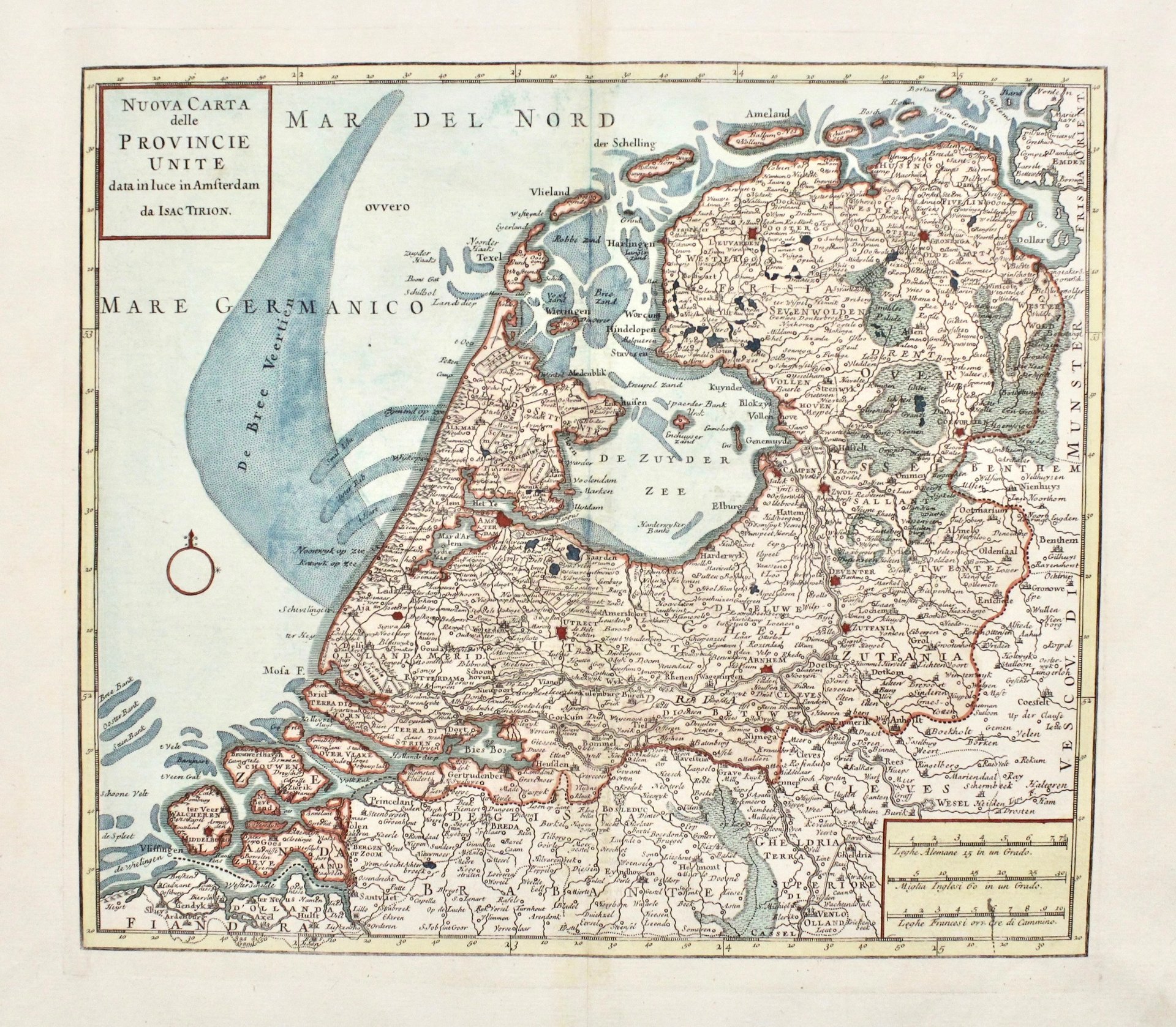 Incisione in rame, dipinta a mano, mm 300x330. Piacevole carta dei Paesi Bassi. Tratta da “Atlante novissimo”. Ottimo esemplare marginoso su carta forte.