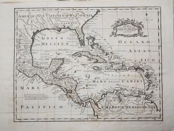 Bella carta delle Indie Occidentali incisa da Veremondo Rossi e pubblicata ne "Il Gazzettiere Americano" edito dalla tipografia di Marco Coltellini nel 1763"Il Gazzettiere americano, contenente un distinto ragguaglio di tutte le parti del Nuovo Mondo", in 3 volumi, con testi curati da Giuseppe Pazzi, rappresenta la prima traduzione italiana, arricchita di note e carte, del "The American Gazetteer" pubblicato l'anno prima a Londra da Millar&Tonson. La traduzione italiana ottenne un ottimo successo di vendita.I disegni e le carte che corredano l'atlante, sono derivate dai modelli del cartografo francese Jacques Nicolas Bellin, usate per sia per il "Petit Atlas Maritime" che per "Histoire Generales de Voyages", rispetto alle quali son tuttavia arricchite da cartigli decorativi e finemente incise. Le opere portano le firme di Veremondo Rossi, Andrea Scacciati, Giuseppe Maria Terreni e anche Violante Vanni, un raro caso italiano di impegno femminile in campo cartografico. Incisione su rame, in ottimo stato di conservazione. Nice map of West Indies engraved by Veremondo Rossi and published into Il Gazzettiere Americano, edited in 3 volumes by Marco Coltellini, Livorno, 1763. The atlas, in 3 volumes, with texts written by Giuseppe Pazzi, is the first Italian translation, enriched with notes and cards of "The American Gazetteer" published the year before in London by Millar & Tonson. The maps accompanying the atlas are derived from the French cartographer Jacques Nicolas Bellin, used for both the "Petit Atlas Maritime" and for "Histoire Generales de Voyages", with respect to which, however, are embellished with decorative cartouches and finely engraved. The works bear the signatures of Veremondo Rossi, Andrea Scacciati, Giuseppe Maria Terreni and also Violante Vanni, a rare case of Italian women's engagement in the cartographic field.Copper etching, in very good condition. Cfr.