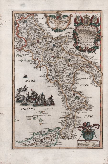 Bellissima e accurata carta del Regno di Napoli, dedicata al Re di Napoli, tratta dall’ ' Accuratissima e Nuova Delineazione del Regno di Napoli, con le sue Provincie distinte… da Antonio Bulifon. In Napoli, L’anno MDC.XCII. La ' Accuratissima e Nuova Delineazione del Regno di Napoli ' è il primo atlante interamente concepito, disegnato, inciso e stampato a Napoli. Le carte sono tutte incise e firmate dallo spagnolo Francesco Cassiano de Silva e pubblicate dal libraio di origine francese Antonio Bulifon (1649-1714). Nel 1692 si ebbe una prima tiratura dell'atlante con 20 tavole; Bulifon dedicò l'atlante del Regno di Napoli a Cosimo III granduca di Toscana, il "più gran signore che Terre in quello possiede", come recita nella dedica della tavola del regno. Intermediario tra l'editore napoletano e il granduca fu Antonio Magliabechi con il quale Bulifon intrattenne un lungo e interessante carteggio. Della vita di Francesco Cassiano de Silva si possiedono scarsissime informazioni; cionondimeno, è indubbia la sua fama come incisore di molte opere relative al Regno di Napoli. In particolare, incise per commissione opere pubblicate dai più importanti editori di Napoli del suo periodo, cioè Antonio Bulifon, Domenico Antonio Parrino e Luigi Mutio. Collaborò anche con Giovan Battista Pacichelli. Le fonti sono discordanti sulla sua origine; alcune fonti affermano che era milanese, mentre altre fonti affermano che era spagnolo. L'ultimo suo lavoro certo è un atlante manoscritto conservato nella Biblioteca Nazionale di Vienna, terminato nel 1708. In tale ultima opera si firma "nobile milanese", mentre nelle precedenti incisioni si era sempre fregiato del titolo di "hispanicus". I due dati potrebbero non essere in contraddizione in quanto Francesco potrebbe appartenere ad un ramo cadetto della famiglia spagnola dei Silva stanziatasi nel milanese nel corso del XVI secolo. È molto probabile che con la venuta degli austriaci nel Regno di Napoli, nel 1707, Francesco Cassiano de Silva abbia preferito riferirsi alle più prossime e meno pericolose origini milanesi. ' ' Egli risulta coinvolto anche nella realizzazione delle immagini delle varie città e terre del Regno di Napoli avviate tra il 1692 ed il 1695 da Giovambattista Pacichelli quale corredo iconografico al suo libro ' Il Regno di ' Napoli ' in ' prospeniva, ' consegnato per le stampe nel 1692 agli editori Mutio e Parrino. Dell’atlante si conoscono 3 edizioni diverse stampate nel 1692, composte prima da 20 e poi da 21 carte. L’ultima edizione, postuma, venne curata nel 1734 da Luigi Bulifon, nipote di Antonio. Da notare che i rami delle carte geografiche andarono dispersi durante l'occupazione di Napoli da parte degli Austriaci nel 1707. Solamente il fortunoso ritrovamento degli stessi nel 1734 ad opera di Luigi Bolifoni, rientrato a Napoli al seguito di Carlo di Borbone, permise la pubblicazione di questa edizione dedicata al nuovo Re. Si compone di sole 19 carte, in quanto probabilmente la lastra della carta del Molise e di quella della Sardegna non furono recuperate. Incisione in rame con magnifica coloritura coeva (con ritocchi), restauro alla piega centrale, per il resto in ottimo stato di conservazione. Bibliografia V. Valerio, ' Il primo atlante a stampa del Regno di Napoli di Francesco Cassiano de Silva, in “Amate sponde Le Rappresentazioni dei Paesaggi Costieri Mediterranei”, Gaeta, 2003; V. Valerio, ' Sicilia 1477-1861, la collezione Spagnolo-Patermo in quattro secoli di cartografia, ' 2014; G. Amirante, M. R. Pessolano, Immagini di Napoli e del regno. Le raccolte di Francesco Cassiano de Silva ' (2006). Beautiful and accurate map of South of Italy, dedicated to the King of the Kingdom of Naples, taken from the ' Accuratissima e Nuova Delineazione del Regno di Napoli, con le sue Provincie distinte… da Antonio Bulifon. In Napoli, L’anno MDC.XCII. The ' Accuratissima e Nuova Delineazione del Regno di Napoli ' is the first atlas entirely conceived, drawn, engraved and printed in Naples. ' The maps are all engraved and signed by Francesco Cassiano de Silva and published by French-born bookseller Antonio Bulifon (1649-1714). In 1692 there was a first edition of the atlas with 20 plates; Bulifon dedicated the atlas of the Kingdom of Naples to Cosimo III grand duke of Tuscany. Very few information is possessed of Francesco Cassiano de Silva's life; nevertheless, his fame as an engraver of many works relating to the Kingdom of Naples is undoubted. In particular, he engraved by commission works published by the most important publishers in Naples of his period, namely Antonio Bulifon, Domenico Antonio Parrino and Luigi Mutio. He also collaborated with Giovan Battista Pacichelli. Sources are discordant about his origin; some sources say he was from Milan, while other sources say he was Spanish. His last certain work is a manuscript atlas preserved in the National Library in Vienna, finished in 1708. In that last work he signs himself "noble Milanese," whereas in his previous engravings he always bore the title "hispanicus." The two data may not be contradictory since Francesco may have belonged to a branch of the Spanish Silva family that settled in the Milan area during the 16th century. It is very likely that with the coming of the Austrians to the Kingdom of Naples in 1707, Francesco Cassiano de Silva preferred to refer to the closer and less dangerous Milanese origins. ' ' He also appears to have been involved in the creation of the images of the various cities and lands of the Kingdom of Naples initiated between 1692 and 1695 by Giovambattista Pacichelli as an iconographic kit for his book ' Il Regno di Napoli in prospettiva, ' delivered for printing in 1692 to the publishers Mutio and Parrino. Three different editions of the atlas are known to have been printed in 1692, consisting first of 20 and then of 21 maps. The last edition, posthumously, was edited in 1734 by Luigi Bulifon, Antonio's grandson. Note that the c