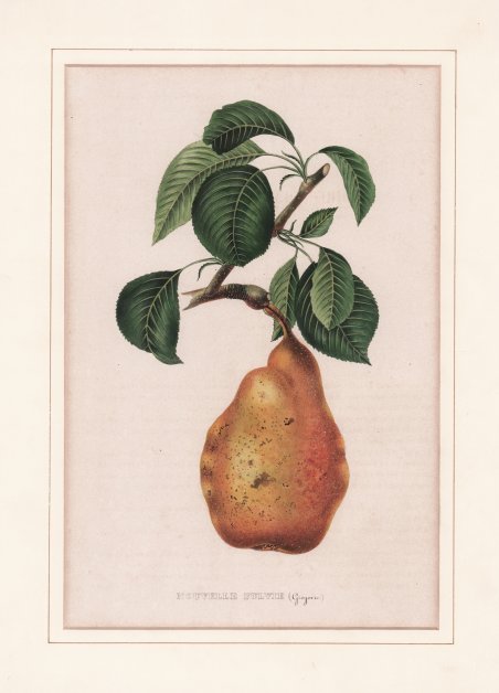 Litografia a colori, 1853-1860, impressa su carta coeva, in perfetto stato di conservazione. La tavola è tratta dagli ' Annales de pomologie belge et étrangère ' (1853-1860) una rivista illustrata di pomologia pubblicata annualmente dalla Commission Royale de Pomologie belga, con Alexandre Bivort come segretario del comitato di redazione (di fatto direttore). Fu stampato a Bruxelles, prima da F. Parent (1853-1858) e poi dalla sua vedova e dal figlio (1859-1860). ' Oltre allo stesso Bivort, contribuirono agli Annales Charles ed Ernest Baltet, Laurent de Bavay, Jules de Liron d'Airoles, Antoine-Joseph Gailly, Charles Auguste Hennau, Alfred Loisel, Auguste Royer, Félix Sahut e Michel Scheidweiler. Alexandre Joseph Désiré Bivort (1809-1872) è stato un orticoltore belga, specializzato in pomologia. Fu particolarmente influente nella sistematizzazione della nomenclatura delle varietà di pere. Educato alla scuola industriale di Melle e al collegio di Aalst, dedicò molto del suo tempo allo studio dell’agricoltura, diventando alla fine un orticoltore a tempo pieno. Nel 1840 acquistò la collezione di semi di Jean-Baptiste Van Mons, che contava circa 20.000 semi, e gradualmente la trasportò nella sua proprietà a Saint-Remy-Geest. Nel 1854 divenne il direttore della Société Van Mons. Corrispondeva con molti importanti pomologi internazionali ed era il segretario del comitato di redazione degli ' Annales de pomologie belge et étrangère ' della Commission Royale de Pomologie (1853-1860), a cui contribuì in modo sostanziale. Bibliografia Émile Rodigas, "À la mémoire d’Alexandre Bivort", Bulletins d’arboriculture, de floriculture et de culture potagère ' (1872), p. 275; Anne-Marie Bogaert-Damin, "L’illustration des revues d’horticulture en Belgique au XIXe siècle", In Monte Artium, 7 (2014), pp. 155-176. Colour litograph, 1853-1960, printed on contemporary paper, good condition. The plate is taken from ' Annales de pomologie belge et étrangère (1853–1860), an illustrated pomology review published annually by the Belgian Commission Royale de Pomologie, with Alexandre Bivort as secretary of the editorial committee (effectively editor in chief). It was printed in Brussels, first by F. Parent (1853-1858) and then by his widow and son (1859-1860). ' Apart from Bivort himself, contributors to the Annales included Charles and Ernest Baltet, Laurent de Bavay, Jules de Liron d’Airoles, Antoine-Joseph Gailly, Charles Auguste Hennau, Alfred Loisel, Auguste Royer, Félix Sahut, and Michel Scheidweiler. Alexandre Joseph Désiré Bivort (1809–1872) was a Belgian horticulturalist, specialising in pomology. He was particularly influential in systematising the nomenclature of strains of pear. He devoted much of his time to the study of griculture, eventually becoming a full-time horticulturalist. In 1840 he acquired the seed collection of Jean-Baptiste Van Mons, numbering about 20,000 seeds, and gradually transported it to his own property at Saint-Remy-Geest. In 1854 he became the director of the Société Van Mons. He corresponded with many leading international pomologists, and was the secretary of the editorial committee of the Commission Royale de Pomologie's ' Annales de pomologie belge et étrangère ' (1853–1860), to which he was a substantial contributor. Bibliografia Émile Rodigas, "À la mémoire d’Alexandre Bivort", Bulletins d’arboriculture, de floriculture et de culture potagère ' (1872), p. 275; Anne-Marie Bogaert-Damin, "L’illustration des revues d’horticulture en Belgique au XIXe siècle", In Monte Artium, 7 (2014), pp. 155-176. Cfr.