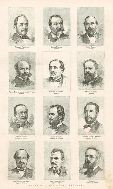 Ritratto in unico foglio di senatori e deputati: Tommaso Vallauri, Cesare Pastore, Luigi Ranco, Pietro Ugo, Sansone D’Ancona, Antonio Ranieri, Cesare Parodi di Genova, Pier Desiderio Pasolini di Ravenna, Ludovico Maranca Antinori di Chieti, Eugenio Balsamo di Lecce, Secondo Frola di Ivrea e Borsari di Modena. Testo al verso