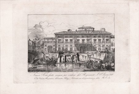 Nuovo porto fatto erigere per ordine del regnante S. P. Leone 12: colla veduta prospettica dell'antico palazzo Salviati, ora d'appartenenza della R. C. A. Veduta di palazzo Salviati presso il porto di Ripa Grande. Titolo in basso al centro. Indicazione dell'incisore in basso a sinistra: Paoletti Veneto inc. Roma 1827. In primo piano, il Tevere con alcune imbarcazioni; sullo sfondo il palazzo Salviati alla Lungara. Si riferisce alle modifiche al porto apportate sotto papa Leone XII. Rarissima incisione del pittore bellunese Pietro Paoletti, realizzata appena giunto a Roma, chiamato alla corte pontificia su espressa richiesta di Leopoldo Cicognara. L’unico esemplare dell’opera che abbiamo rintracciato è conservato alla Biblioteca Nazionale di Roma. Pietro Paoletti fu pittore, incisore e decoratore, attivo lungamente a Roma alla corte di papa Gregorio XVI. Nacque a Belluno il 24 settembre 1801, e fu indirizzato alla carriera artistica grazie all’interessamento del conte Giuseppe Agosti. Nel 1819 si recò a Padova al seguito del bellunese Giovanni Demin, pittore neoclassico, alla cui scuola rimase per circa otto anni. Alla fine di dicembre del 1819, s’iscrisse, ma frequentò solo per un anno, all’Accademia di Venezia, guidata dal conte Leopoldo Cicognara. Ai primi di aprile del 1826 ricevette la prima commissione importante: fu da parte del nobile Giovanni Antonio de Manzoni che lo chiamò per decorare con scene tratte dall’Orlando furioso (Il ratto di Doralice e Duello di Ruggero e Rodomonte) la sala da pranzo estiva al primo piano della sua villa Crotta, ad Agordo, un lavoro che vide impegnato anche il fratello Giuseppe. Nel 1827 giunse a Roma e, con la raccomandazione di Cicognara, fu introdotto presso il cardinale Placido Zurla, di famiglia veneta, che divenne suo mecenate. L’attività romana ebbe inizio con gli affreschi della facciata di palazzo Lucernari (perduti) e con quelli nella cappella di S. Antonio nella chiesa di S. Isidoro (S. Antonio che resuscita un morto e S. Antonio che vince la durezza di Ezzelino e delle sue schiere). Inseritosi nel cenacolo di Horace Vernet, direttore dell’Accademia di Francia, conobbe Francesco Coghetti, Francesco Podesti e Giovanni Battista Caretti condividendone la polemica contro Jean-Auguste Dominique Ingres, nuovo direttore dell’Accademia dopo Vernet, che lo era stato fino al 1834. A Roma accolse anche Ippolito Caffi, cugino da parte materna, che era già stato suo ospite a Padova (cfr. Chiara Maraghini Garrone - Paoletti Pietro in “Dizionario Biografico degli Italiani” - Volume 81 (2014). Acquaforte, stampata su carta coeva, con margini, in perfetto stato di conservazione. Nuovo porto fatto erigere per ordine del regnante S. P. Leone 12: colla veduta prospettica dell'antico palazzo Salviati, ora d'appartenenza della R. C. A. View of the Salviati palace near the port of Ripa Grande. Title in the lower center. Indication of the engraver in the lower left corner: Paoletti Veneto inc. Rome 1827. In the foreground, the Tiber with some boats; in the background Palazzo Salviati at the Lungara. It refers to the changes made to the port under Pope Leone XII. Very rare engraving by the Belluno painter Pietro Paoletti, made as soon as he arrived in Rome, called to the papal court at the express request of Leopoldo Cicognara. The only exemple of the work that we have traced is kept in the Biblioteca Nazionale in Rome. Pietro Paoletti was a painter, engraver and decorator, active for many years in Rome at the court of Pope Gregory XVI. He was born in Belluno on September 24, 1801, and was directed to the artistic career thanks to the interest of Count Giuseppe Agosti. In 1819 he went to Padua following the Belluno Giovanni Demin, neoclassical painter, whose school remained for about eight years. At the end of December 1819, joined, but attended only for a year, the Academy of Venice, led by Count Leopoldo Cicognara. At the beginning of April 1826 he received his first important commission: it was from the noble Giovanni Antonio de Manzoni who called him to decorate with scenes from the Orlando Furioso (The Rape of Doralice and Duel of Ruggero and Rodomonte) the summer dining room on the second floor of his villa Crotta, in Agordo, a work that also saw his brother Giuseppe engaged. In 1827 he arrived in Rome and, with the recommendation of Cicognara, was introduced to Cardinal Placido Zurla, of Venetian family, who became his patron. The Roman activity began with the frescoes of the facade of the Lucernari palace (lost) and with those in the chapel of S. Antonio in the church of S. Isidoro (S. Antonio that resuscitates a dead man and S. Antonio that wins the hardness of Ezzelino and his armies). Inserted in the circle of Horace Vernet, director of the Academy of France, he met Francesco Coghetti, Francesco Podesti and Giovanni Battista Caretti sharing the controversy against Jean-Auguste Dominique Ingres, new director of the Academy after Vernet, who had been until 1834. In Rome he also welcomed Ippolito Caffi, cousin on his maternal side, who had already been his guest in Padua (see Chiara Maraghini Garrone - Paoletti Pietro in "Dizionario Biografico degli Italiani" - Volume 81 (2014). Etching, printed on contemporary paper, with margins, in perfect condition Cfr.