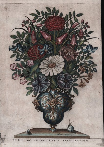 Un vaso con fiori su un tavolo, con una mosca e una lumaca, il vaso decorato con la testa di una creatura demoniaca; copia in controparte di un bulino di Johann-Theodor de Bry da un soggetto di Jacob Kempener. Bulino, circa 1597/1600. Esemplare del secondo stato di due con l'imprint di Stefano Mozzi Scolari che sostituisce il nome di Jan Sadeler. L’opera appartiene alla serie Sei mazzi di fiori in vaso. Numerata e firmata negli angoli inferiori: "6" e "Scolari excudit Venetijs.". Sotto l'immagine, in un nastro, iscrizione latina: "O Flos sic Vernans Ivvenili ætate Pvdorem.". Fa parte di una serie di sei tavole di Johann-Theodor de Bry (due serie di sei tavole: Hollstein 13-24) ed è stata pubblicata da Jan Sadeler I. Stefano Mozzi Scolari acquisto molte delle lastre della tipografia Sadeler, ristampandole apponendo il proprio nome. “Appartiene a una serie di sei copie a grandezza naturale e rovesciate della serie di incisioni di Johann-Theodor de Bry dopo Jacob Kempener (Hollstein nn. 451-56). La serie è stata prodotta in un periodo compreso tra l'arrivo di Jan Sadeler a Venezia nel 1596/7 e la sua morte nel 1600. Se si confrontano le copie di Sadeler con gli originali di De Bry, si può notare una leggera semplificazione e la rinuncia ai bordi ornamentali che caratterizzano gli originali. Sebbene in queste copie le iscrizioni siano collocate sotto gli stessi vasi di fiori di De Bry, l'ordine numerico è stato modificato. Un'altra serie di copie fu pubblicata da Jean Messager e Jean Picquet intorno al 1620. Il ruolo dei Sadeler, stabilitisi a Venezia nel 1596 o 1597, fu importante, poiché portarono in città nuovi approcci e nuovi generi alla stampa. Questa serie di fiori in vaso ebbe un ruolo molto importante nell'introdurre una nuova categoria di soggetti e fu subito molto influente. Le serie di copie con gli indirizzi di Filippo Succhiello e Pietro Paolo Tozzi ne sono un’indicazione. La serie Tozzi di 6 esemplari (300 x 230 mm circa), di cui uno con indirizzo "Pietro Paolo Tozzi formis Padova", è approssimativa e spesso sommaria, con molti errori nella trascrizione delle iscrizioni latine. Una serie di otto esemplari, compresi i sei di Sadeler, è stata pubblicata da Succhielli a Siena. Esiste anche una serie di copie in formato ridotto (192 x 145 mm) pubblicate da uno della famiglia Sadeler. Nel Nord esisteva una tradizione di dipinti di fiori in vaso, che può essere fatta risalire almeno all'opera di Ludger Tom Ring il Giovane a Münster; una delle sue opere è datata 1562. Le stampe di Theodore de Bry da Kempener, purtroppo non datate, furono innovative nell'introduzione del soggetto nella grafica. I bordi ornamentali di questa serie originale indicano che erano state concepite come stampe da incorniciare e appendere al muro. In tutti i dipinti i fiori sono disposti in modo da stabilire un forte grado di simmetria laterale: quella che Bergström chiamava composizione radiale. I vasi sono molto elaborati, ognuno è un'invenzione a sé stante, e si inseriscono nella tradizione delle serie di stampe di vasi che inizia con Agostino Veneziano (Bartsch XIV.387.541-552). Ci si chiede se le iscrizioni siano significative. Esse percorrono abilmente la declinazione della parola Flos, che in latino significa fiore. Nella presente serie di copie, la n. 5, con la sua iscrizione sulla fugacità del fiore che ci ricorda il nostro invecchiamento, ha fiori che sembrano troppo gonfi. Il n. 3, invece, con il suo riferimento alla tenerezza della giovinezza come alla tenerezza dei fiori, presenta boccioli e fiori che si stanno appena schiudendo, accanto a quelli già aperti. È interessante il fatto che ai fiori vengono attribuiti diversi tipi di significati, non solo per ricordarci monotonamente la nostra mortalità. Il n. 4, ad esempio, contiene l'ingiunzione di imparare dal fiore a vivere decentemente (A FIORE ACCIPIAS HONESTE VIVERE DISCAS), che potrebbe essere un riferimento al Discorso della Montagna (Matteo. A vase with flowers on a table, with a fly and a snail, the vase decorated with the head of a demonic creature; copy in reverse after Johann-Theodor de Bry who engraved after Jacob Kempener. Engraving, circa 1597/1600. Example of the second state of two with the Stefano Mozzi Scolari imprint that replace the Jan Sadeler’s name. Form the series of Six Bunches of Flowers in Vases. Numbered and signed in lower corners of impression: "6" and "Scolari excudit Venetijs.". Lettered in Latin below image, in a banderole: "O Flos sic Vernans Ivvenili ætate Pvdorem.". This is one of a series of six plates after Johann-Theodor de Bry (two sets of six plates: Hollstein 13-24) and published by Jan Sadeler I. “This belongs to a set of six full-sized, reversed copies of Johann-Theodor de Bry's series of engravings after Jacob Kempener (Hollstein nos.451-56). The set will have been produced at some time between Jan Sadeler's arrival in Venice in 1596/7 and his death in 1600. When the Sadeler copies are compared with De Bry's originals it can be seen that a slight simplification has taken place and that they dispense with the ornamental borders which are a marked feature of the originals. Although in these copies the inscriptions are placed beneath the same vases of flowers as in De Bry's, the numerical order has been changed. Another set of copies was published by Jean Messager and Jean Picquet c.1620. The role of the Sadelers who settled in Venice in 1596 or 1597 was an important one, for they brought into the city new approaches to printmaking and new genres of print. This series of flowers in vases had a very important role in introducing a new category of subject matter, and they were immediately very influential. Sets of copies bearing the addresses of Filippo Succhiello and Pietro Paolo Tozzi are an indication of that. The Tozzi series of 6 (300 x 230 mm approx.) one of them with address 'Pietro Paolo tozzi formis Padua' are rough and often perfunctory, with many mistakes in the transcr